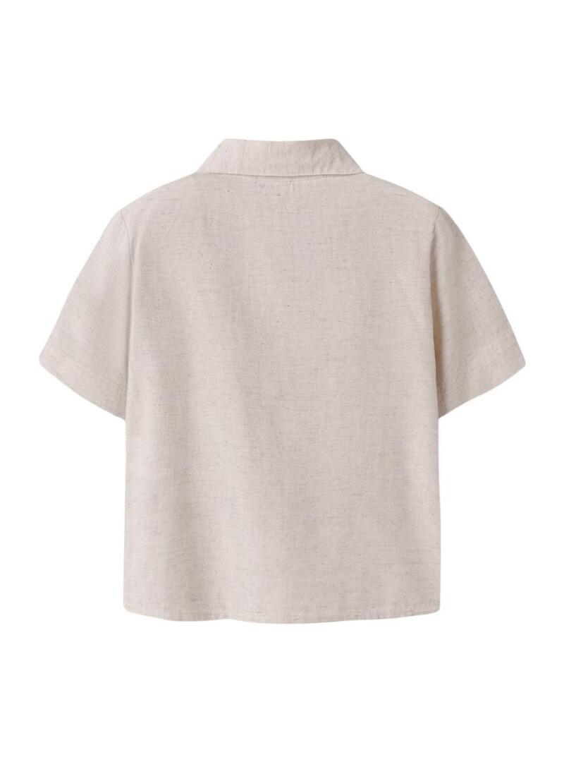 Camisa Name It. Cor creme. Manga curta. Fecho frontal com botões. Bolso no peito. Corte regular. Tecido com linho.