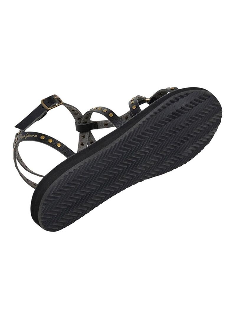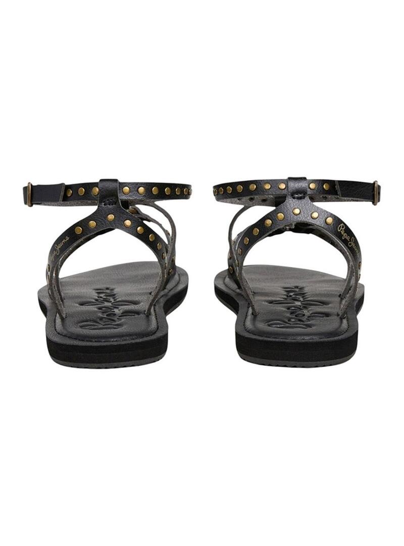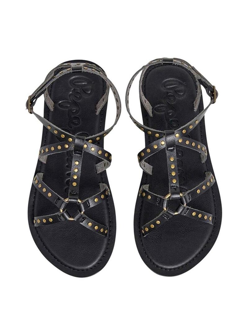 Sandalia Pepe Jeans. Cor preta. Com tachinhas douradas. Tiras cruzadas. Fecho com fivela de metal no tornozelo. Placa de metal com o logotipo da Pepe Jeans na lateral. Logotipo gravado na palmilha.
