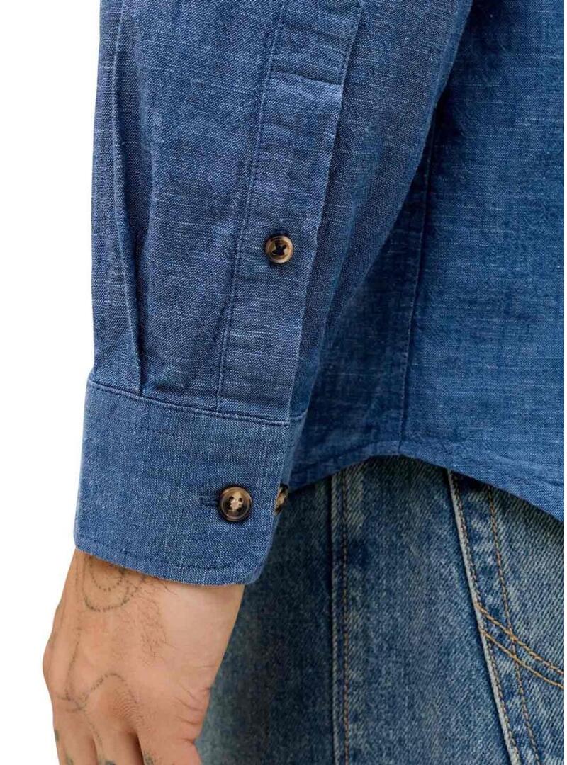 Camisa Jack and Jones. Modelo Summer. Cor azul. Gola camiseira regular. Fecho com botões. Tecido de algodão com linho. Estilo básico. Ajuste regular.
