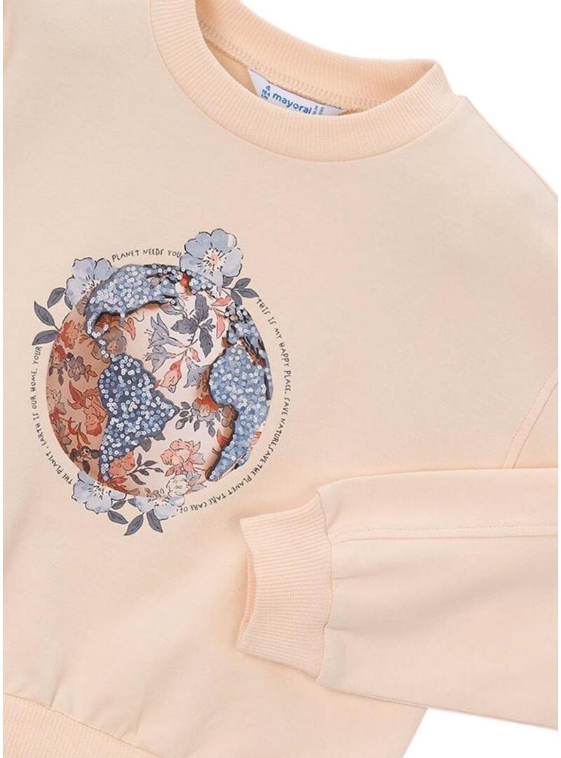 Moletom Mayoral. Cor salmão. Gola redonda. Manga longa. Ajuste folgado. Extremidades caneladas. Ilustração estampada no peito.