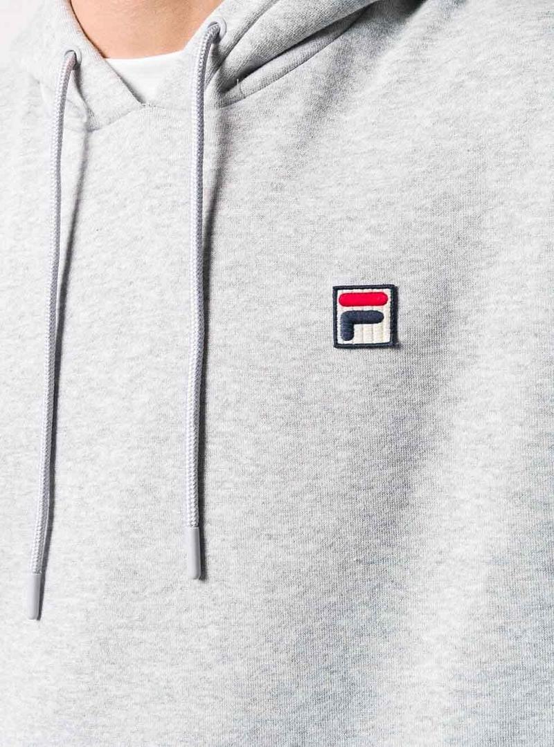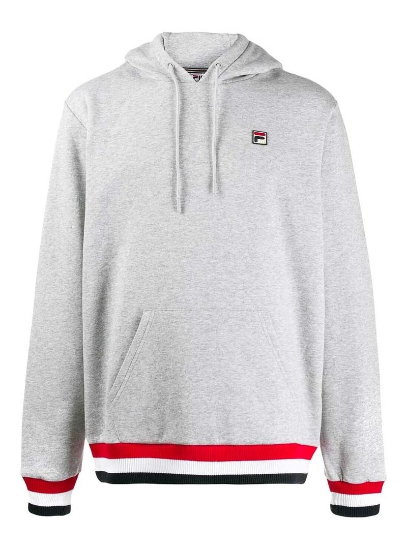 Sweat Fila. Cor cinzenta. Decote con capô. Detalhe das listas nas mangas e na bainha. Atacadores con de capuz ajustável. Patch do logotipo con no peito. Bolso canguru Regular fit A modelo está usando tamanho M.
