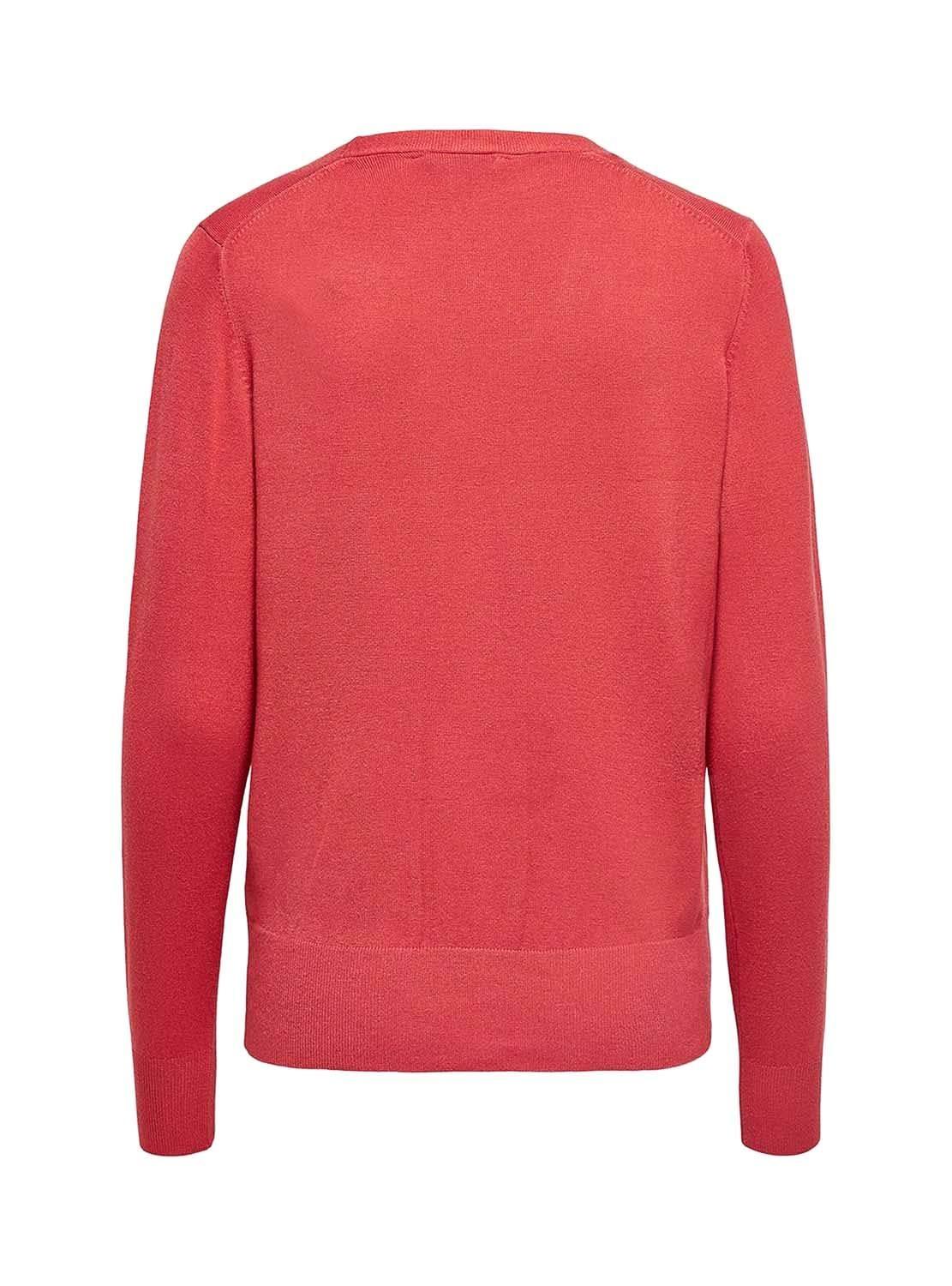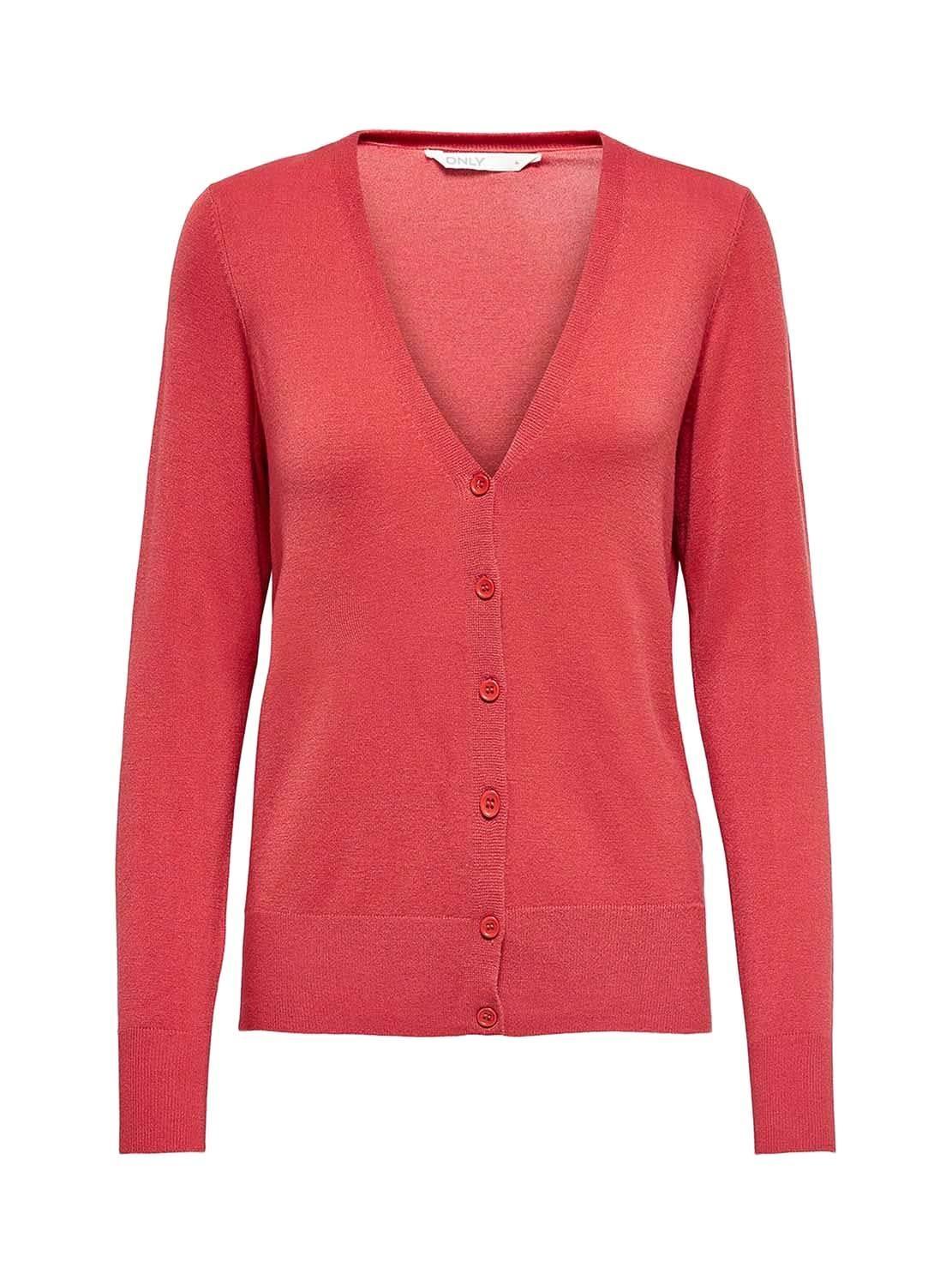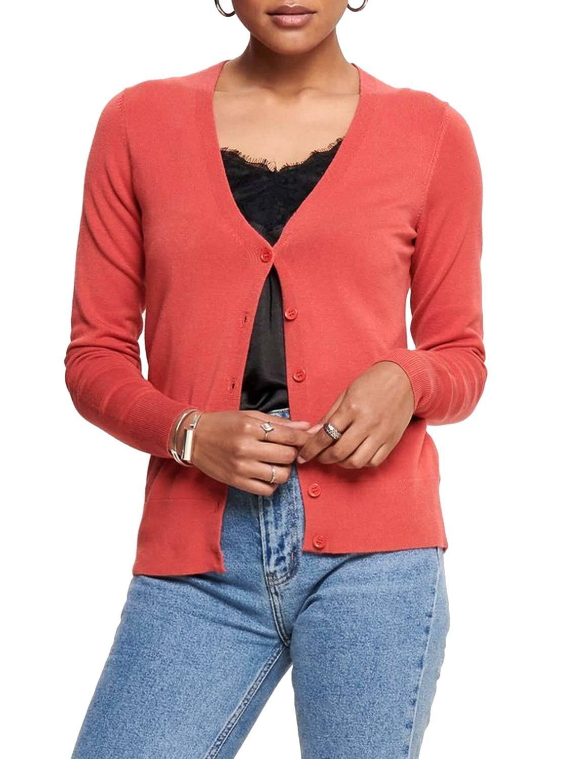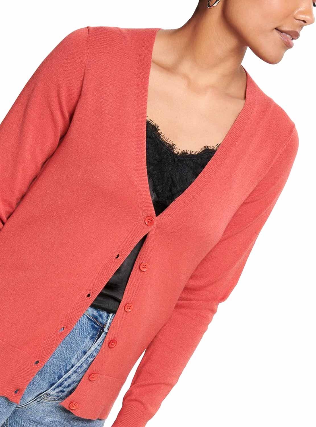 Jaqueta Only. Modelo Venice. Cor coral. Manga comprida. Decote no pico. Fecho dianteiro con botãos. Extremidades com nervuras. Tecido macio e elástico. A modelo está usando tamanho S.