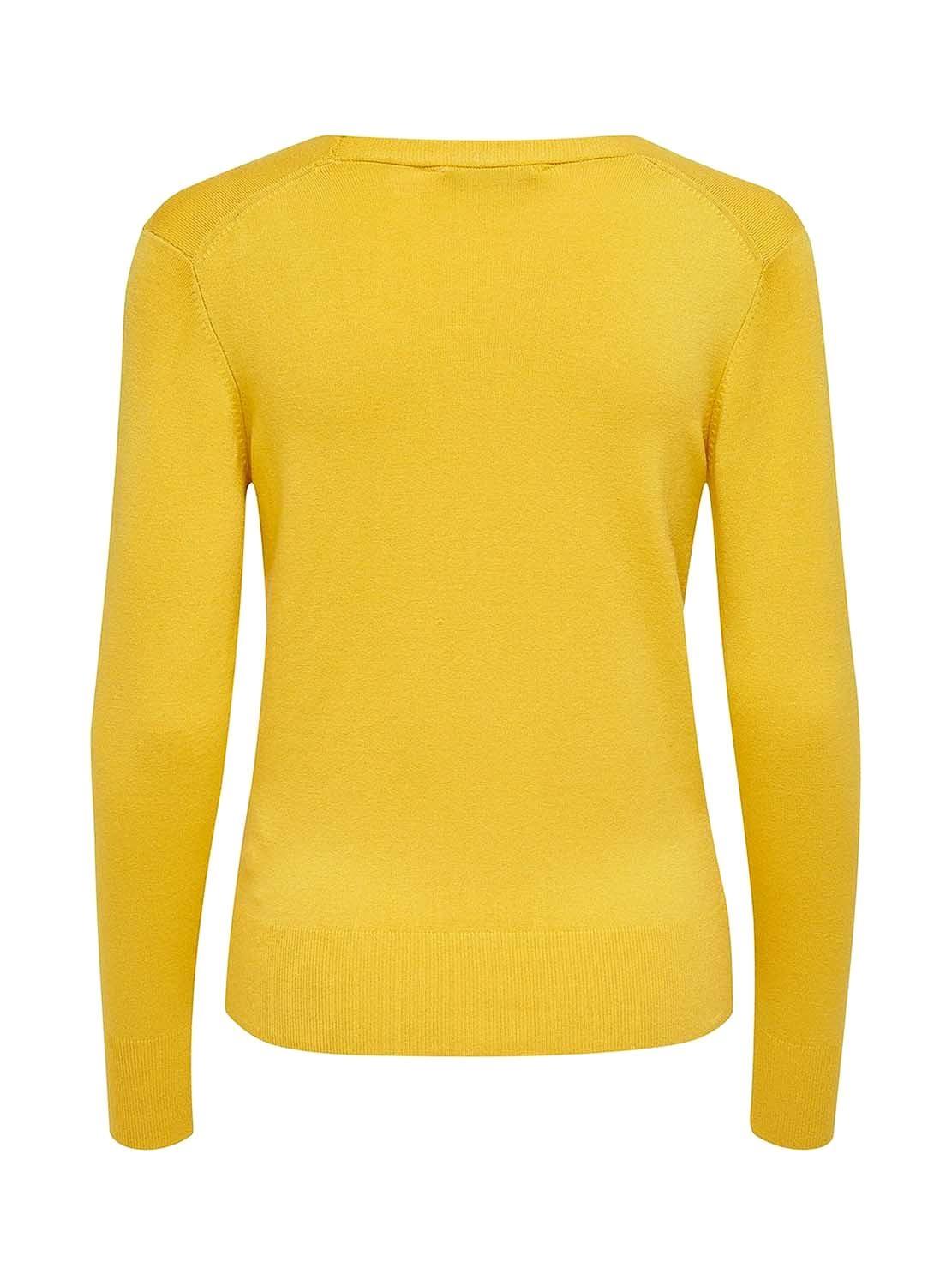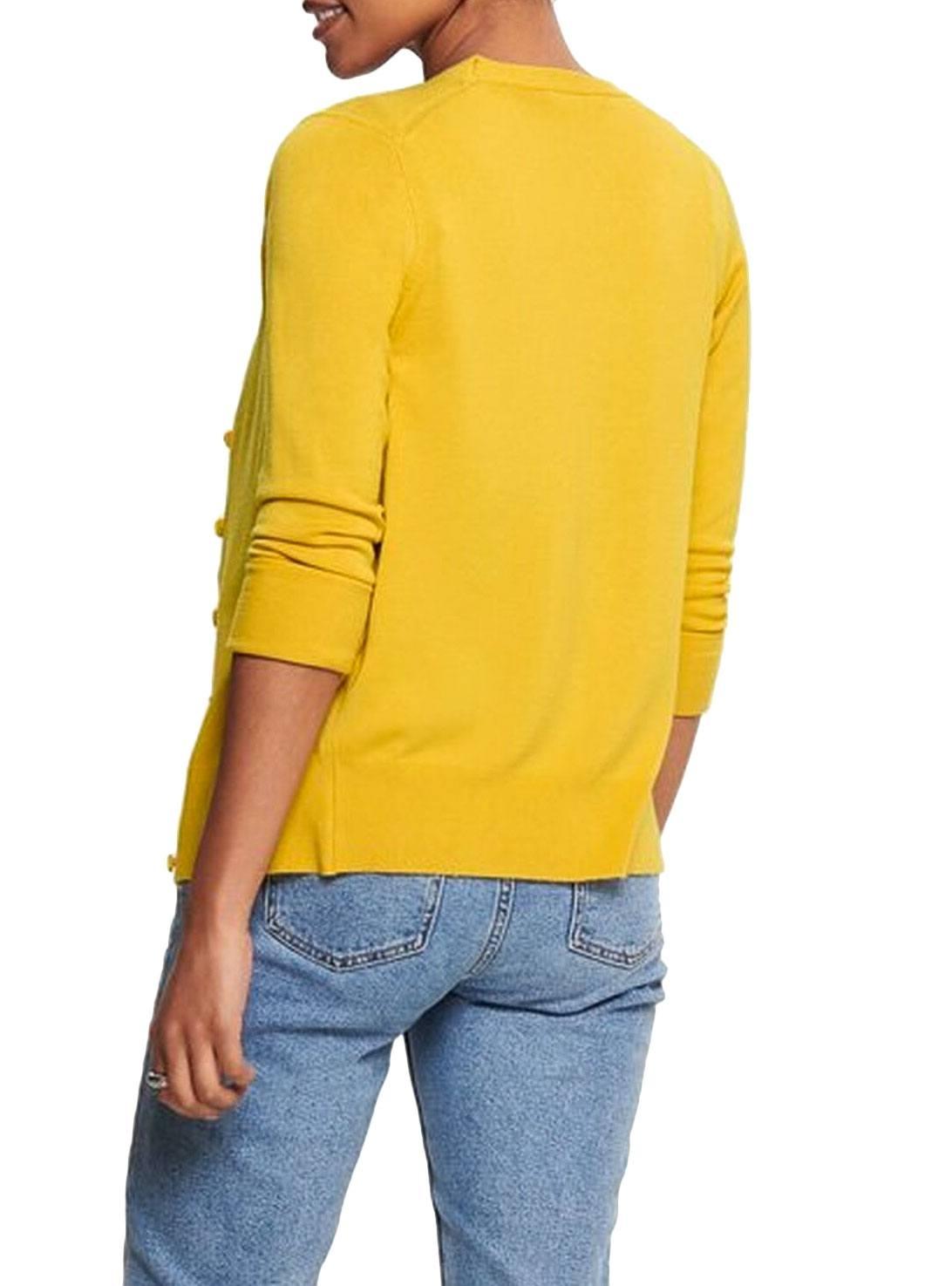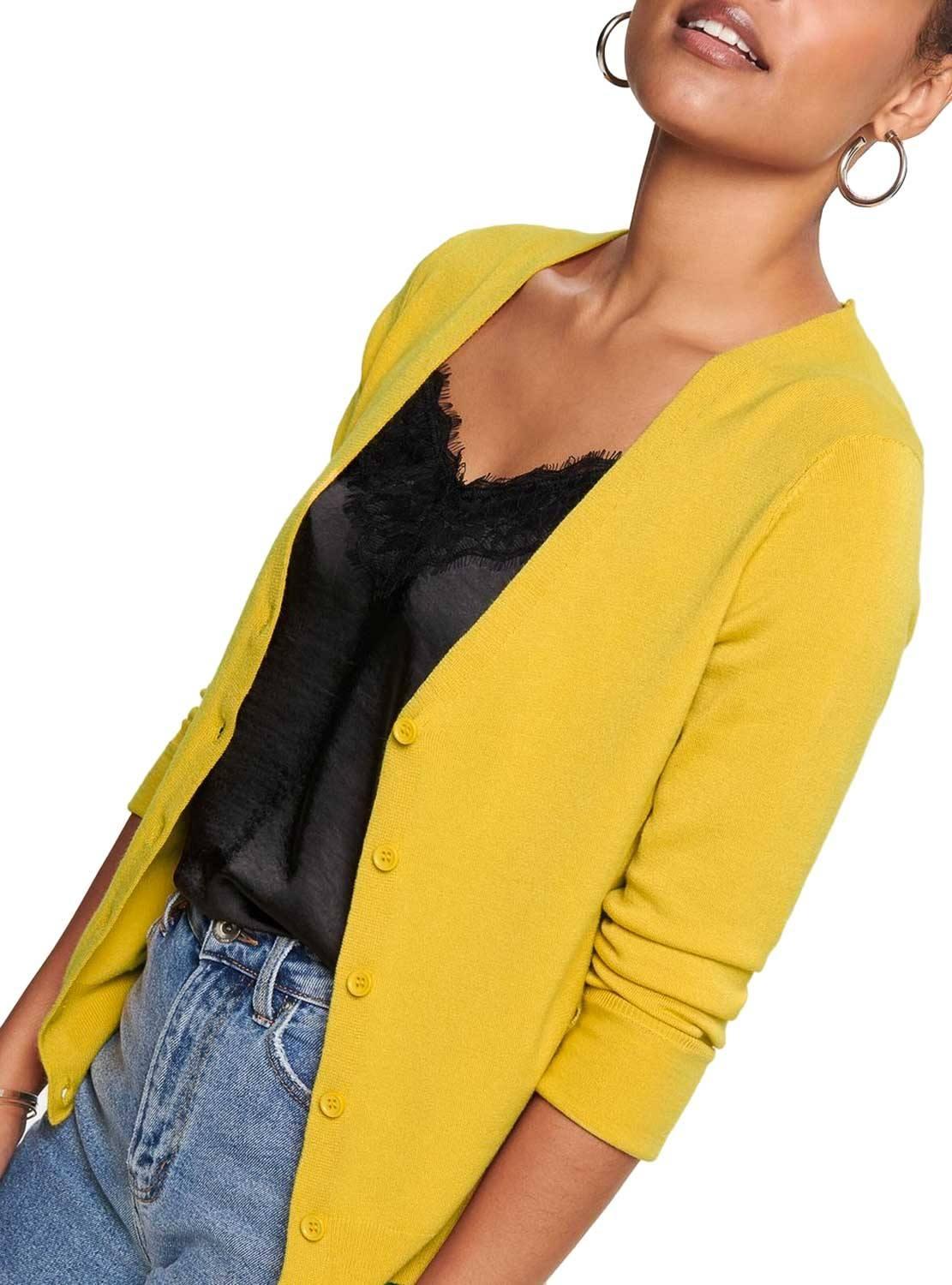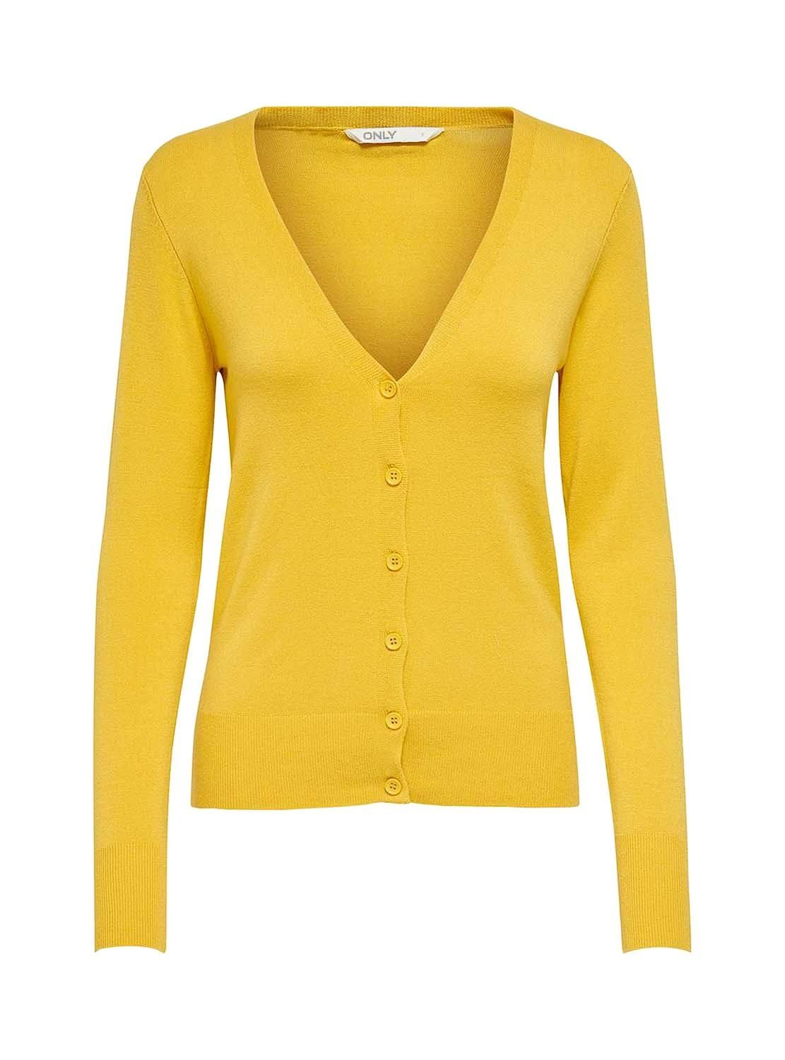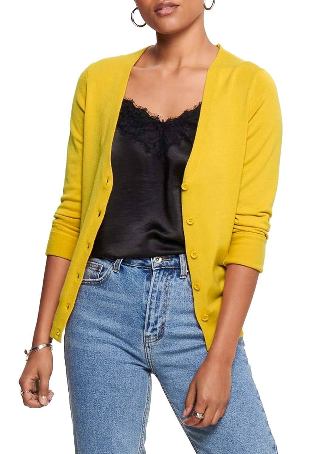 Jaqueta Only. Modelo Venice. Cor Amarelo. Manga comprida. Decote no pico. Fecho dianteiro con botãos. Extremidades com nervuras. Tecido macio e elástico. A modelo está usando tamanho S.