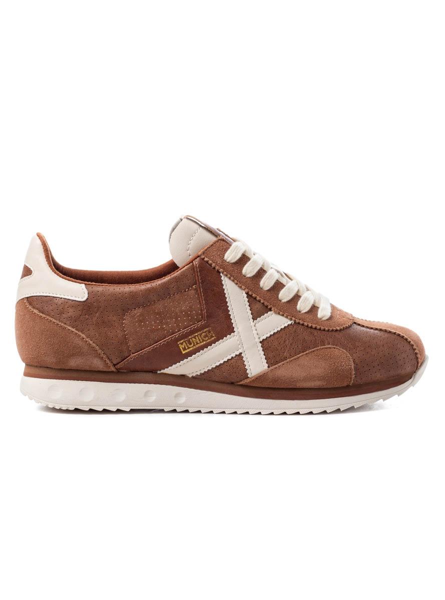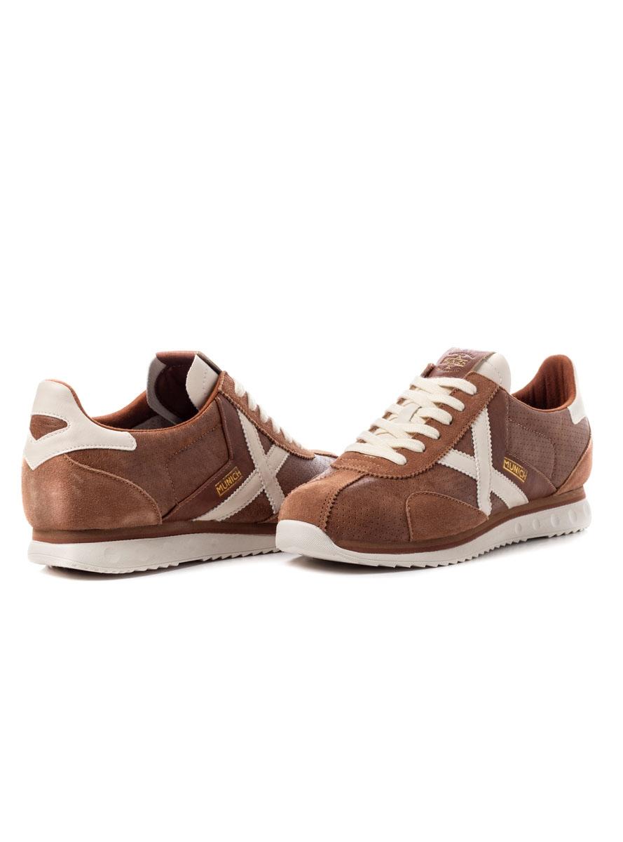 Sapatilhas Munich. Modelo Sapporo. Cor marron. Elaboradas em tecido sintético perfurado. Combinado con couro na mesma tonalidade. Fecho de atacadores. Detalhes em branco. Entressola em EVA. Sola de borracha.