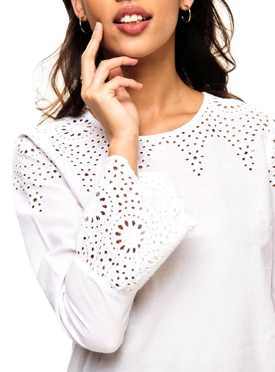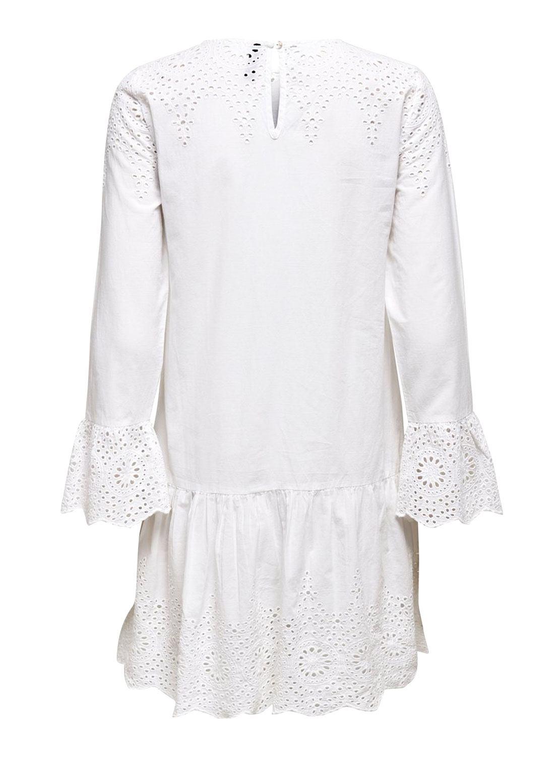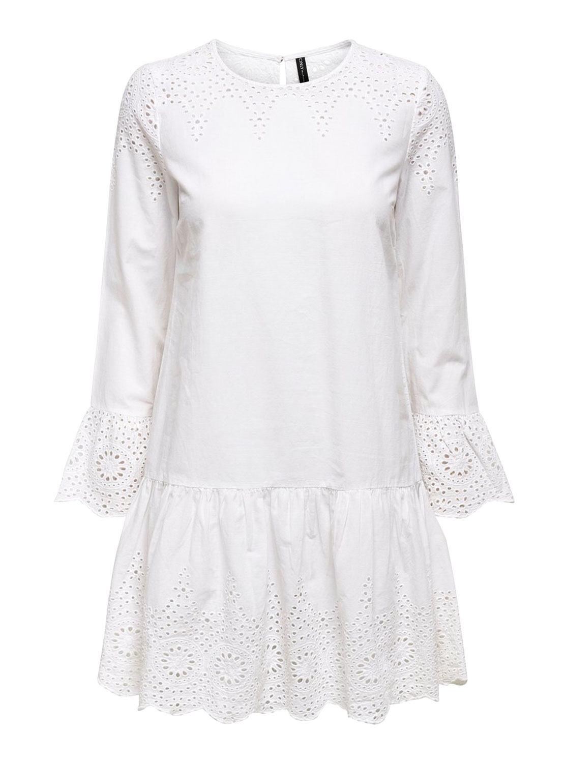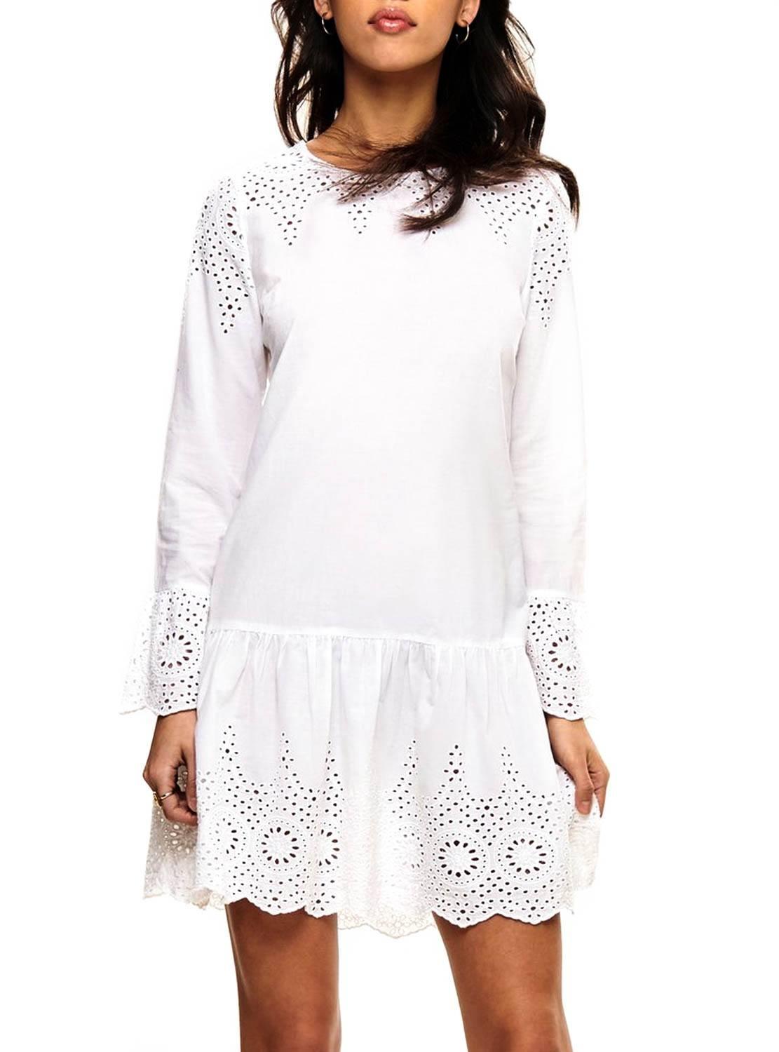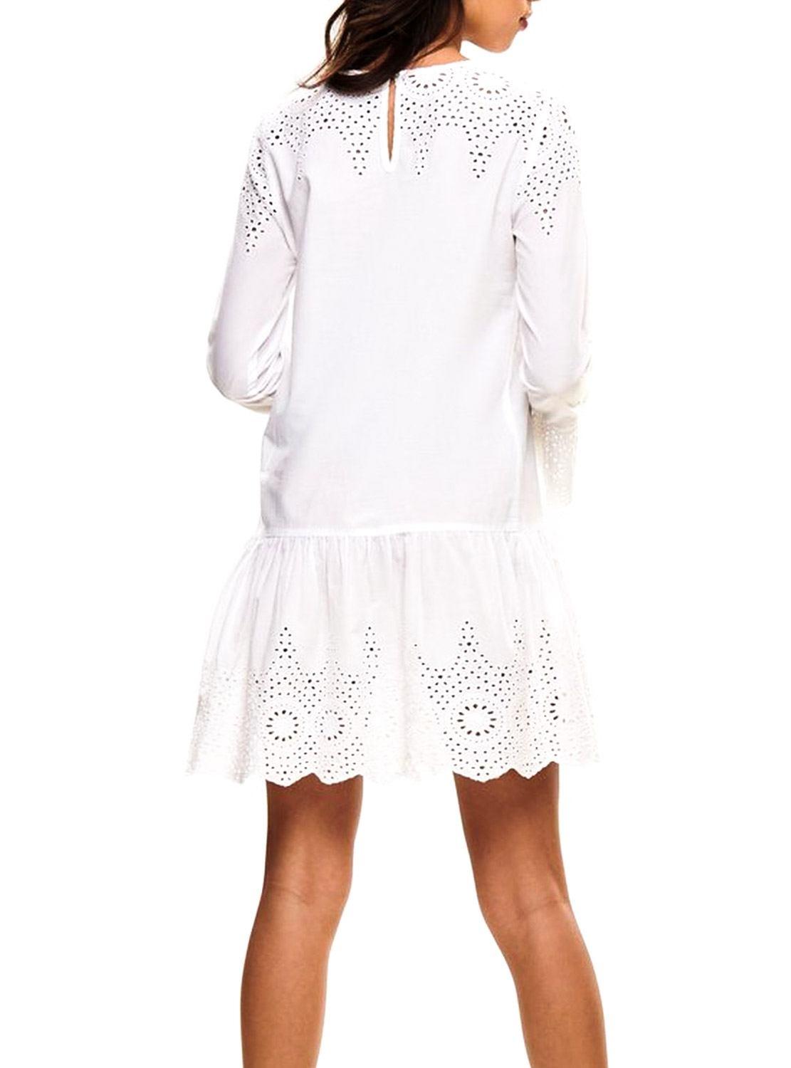 Only vestido. Modelo Alberthe. Cor branca. Detalhes bordados. Pescoço redondo. Manga comprida. Fechamento do botão de volta.