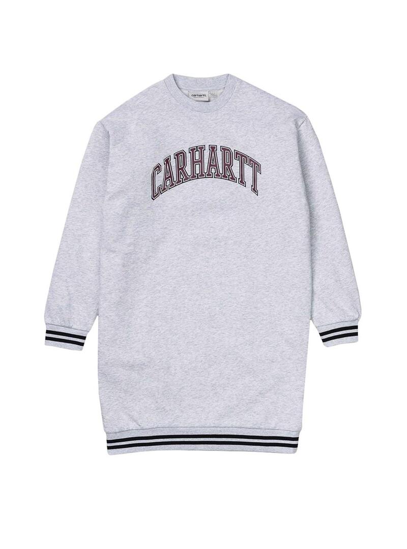 Vestido Carhartt. Modelo Knowledge . Cor cinzenta. Pescoço redondo. Manga comprida. Detalhe de listas. Carhartt no peito. Ajuste solto.