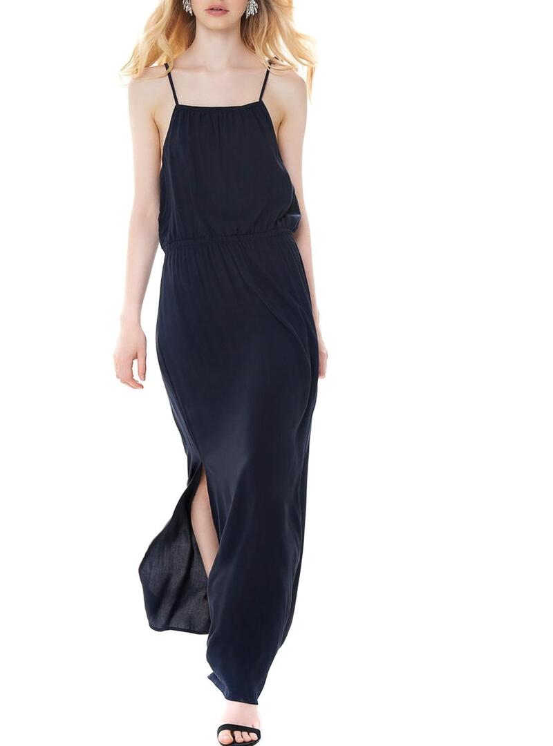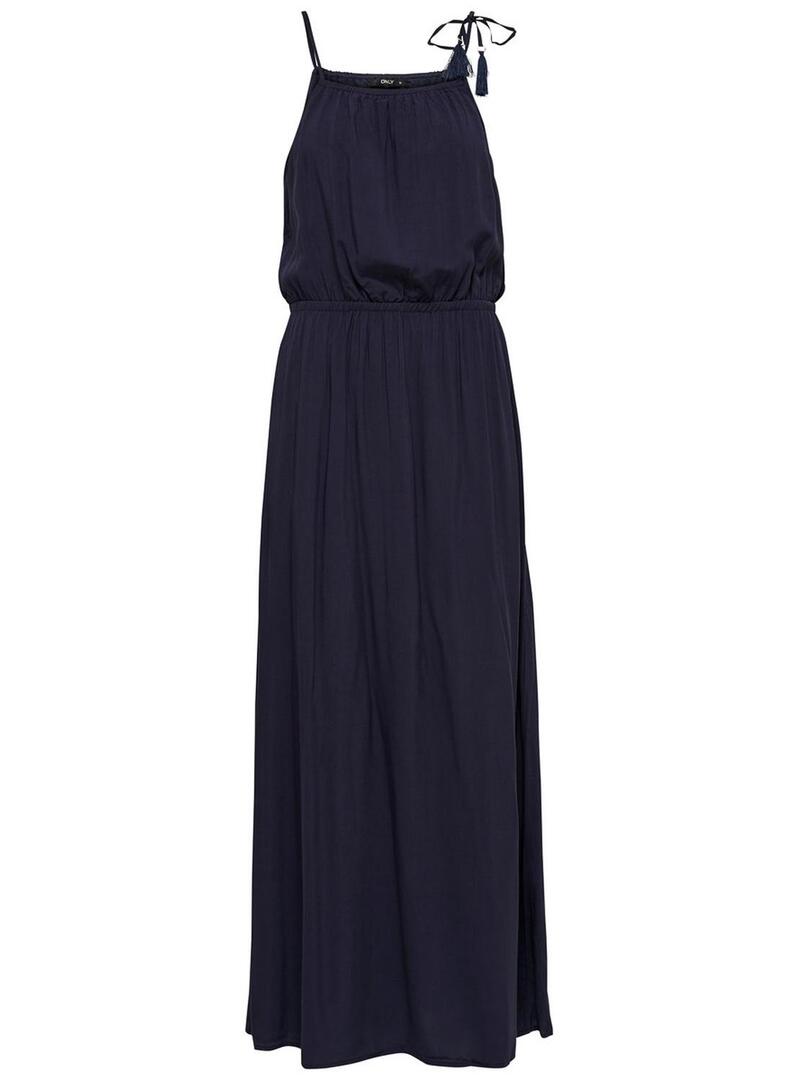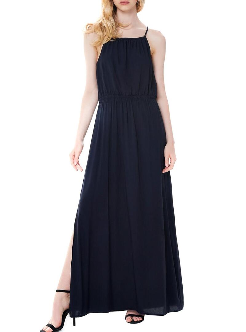 Only vestido. Modelo Lyon. Cor azul. Com alças finas ajustáveis. Formato longo Abertura lateral. Borracha na cintura. O modelo usa tamanho 36.