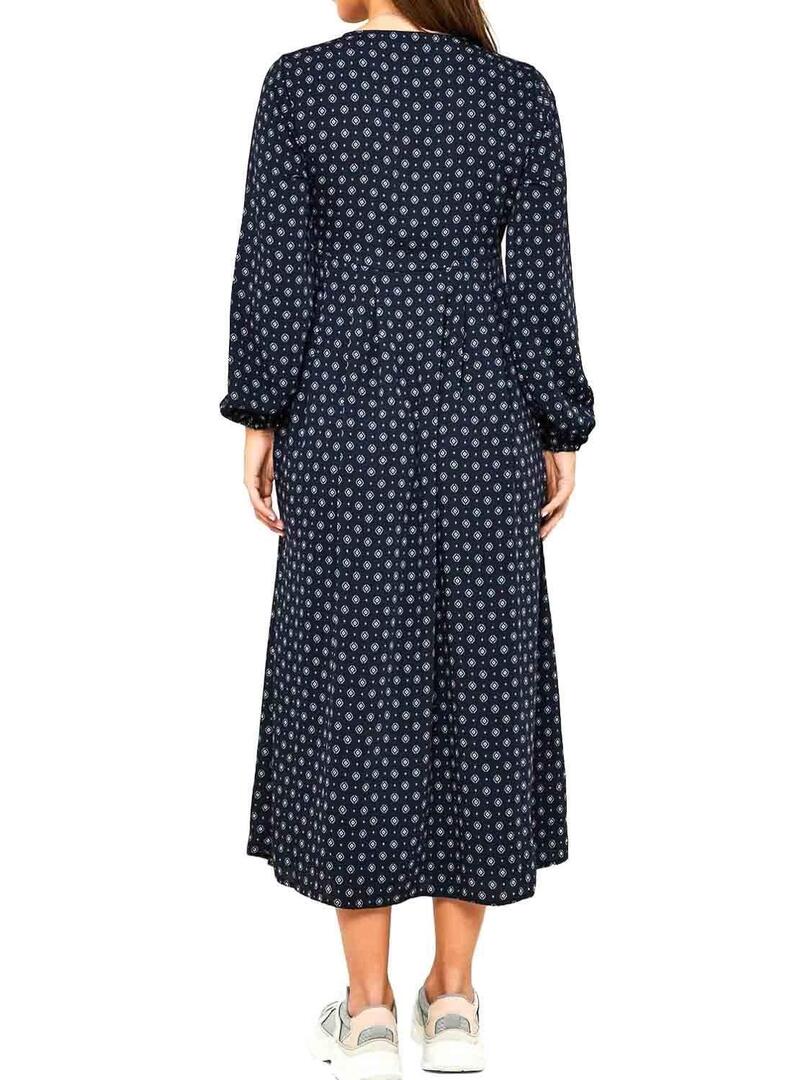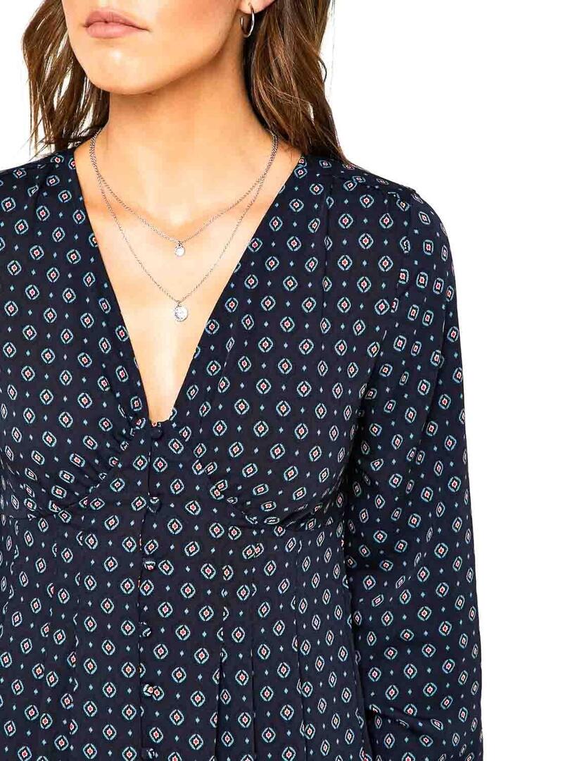 Only vestido. Modelo Vicky Mid. Cor Azul Marinho. Estampagem. Manga comprida. Borda de manga elástica. V Neck. Fecho frontal com botões. O modelo usa tamanho 36.
