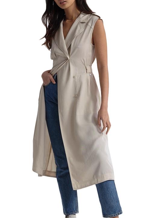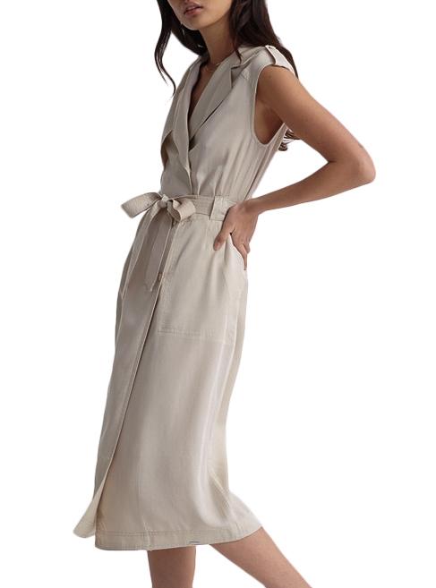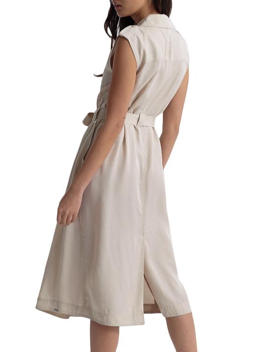Vestido Superdry. Cor bege. Formato cruzado. Fecho de botão. Dois bolsos laterais. Colar com lapelas. Presilhas de cinto presas nos ombros. Distintivo de metal. Sem mangas. Cinto do mesmo tecido.