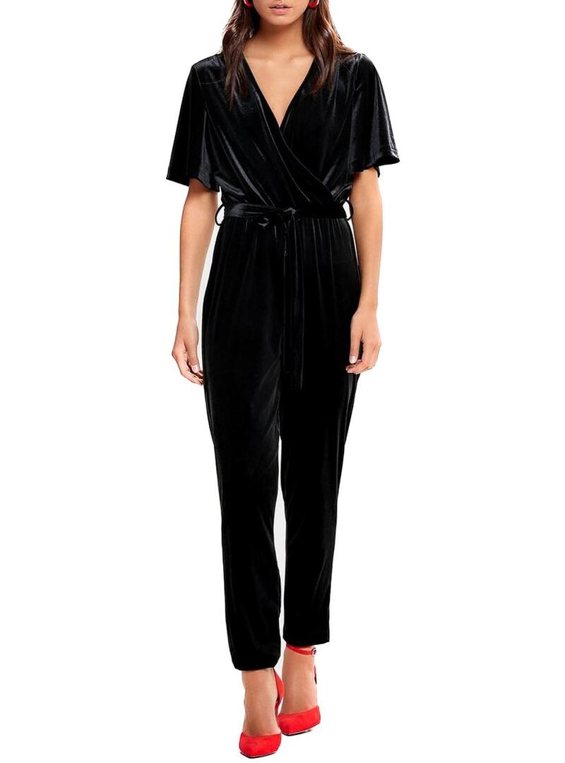 Jumpsuit Only. Modelo Luxe Vevet. Cor preta. Tecido de veludo. Manga curta e larga. Ruga no ombro. V Neck. Volante e decote.