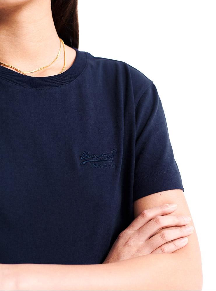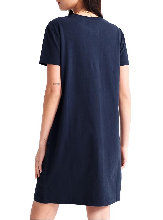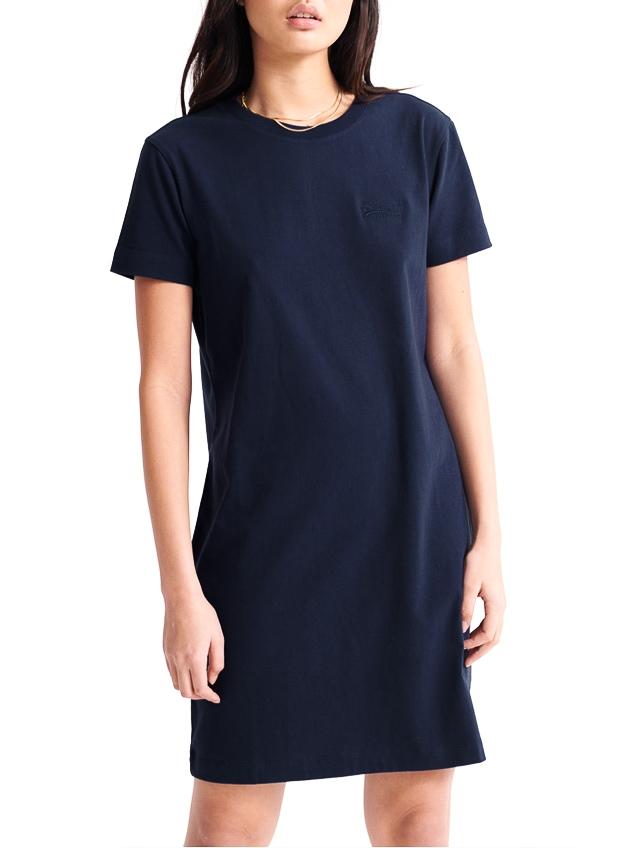 Vestido Superdry. Cor marinha. Estilo de camiseta. Pescoço redondo. Manga curta. Tecido macio. Logotipo bordado no peito. A modelo está usando tamanho S.