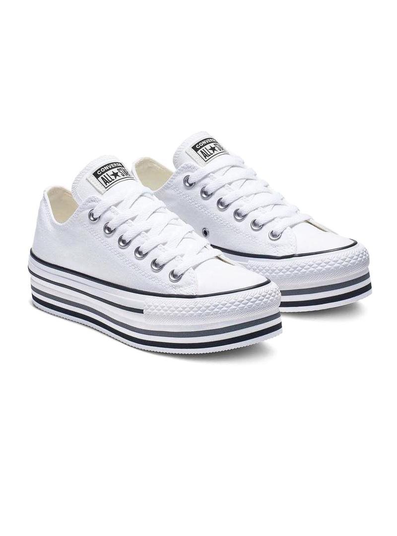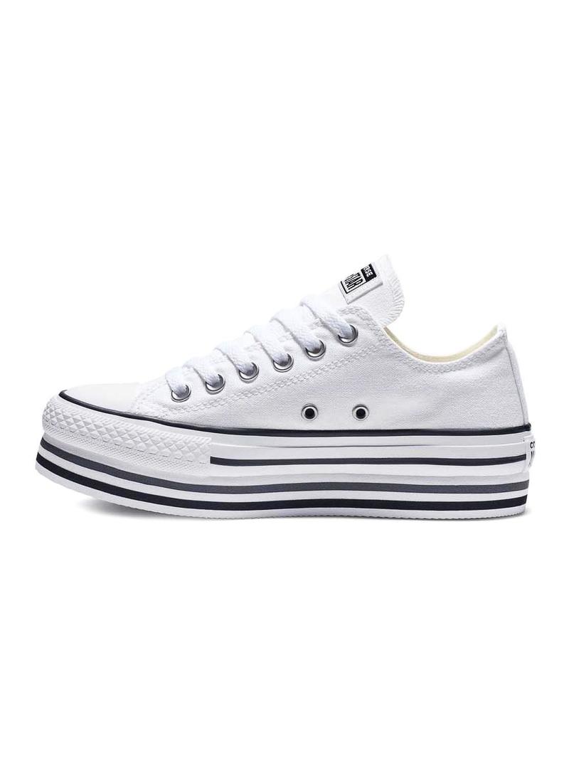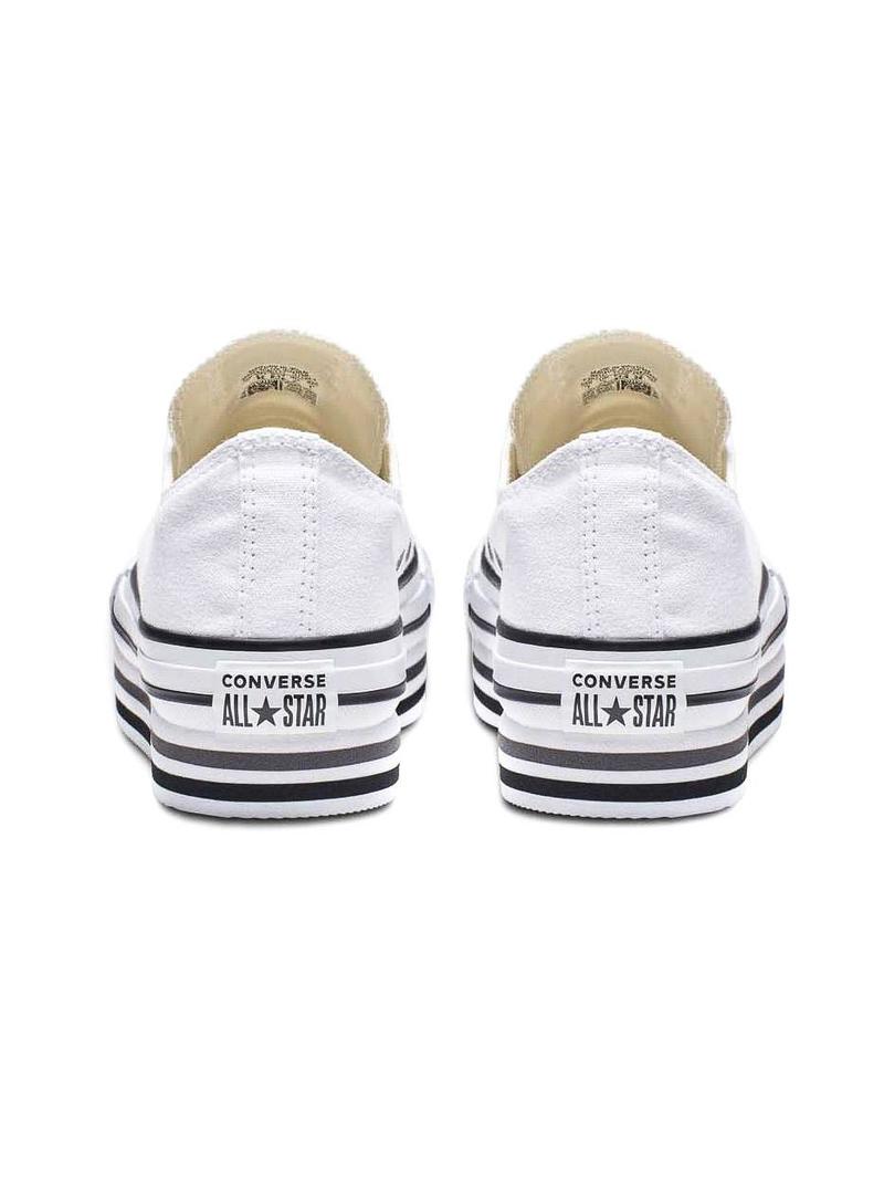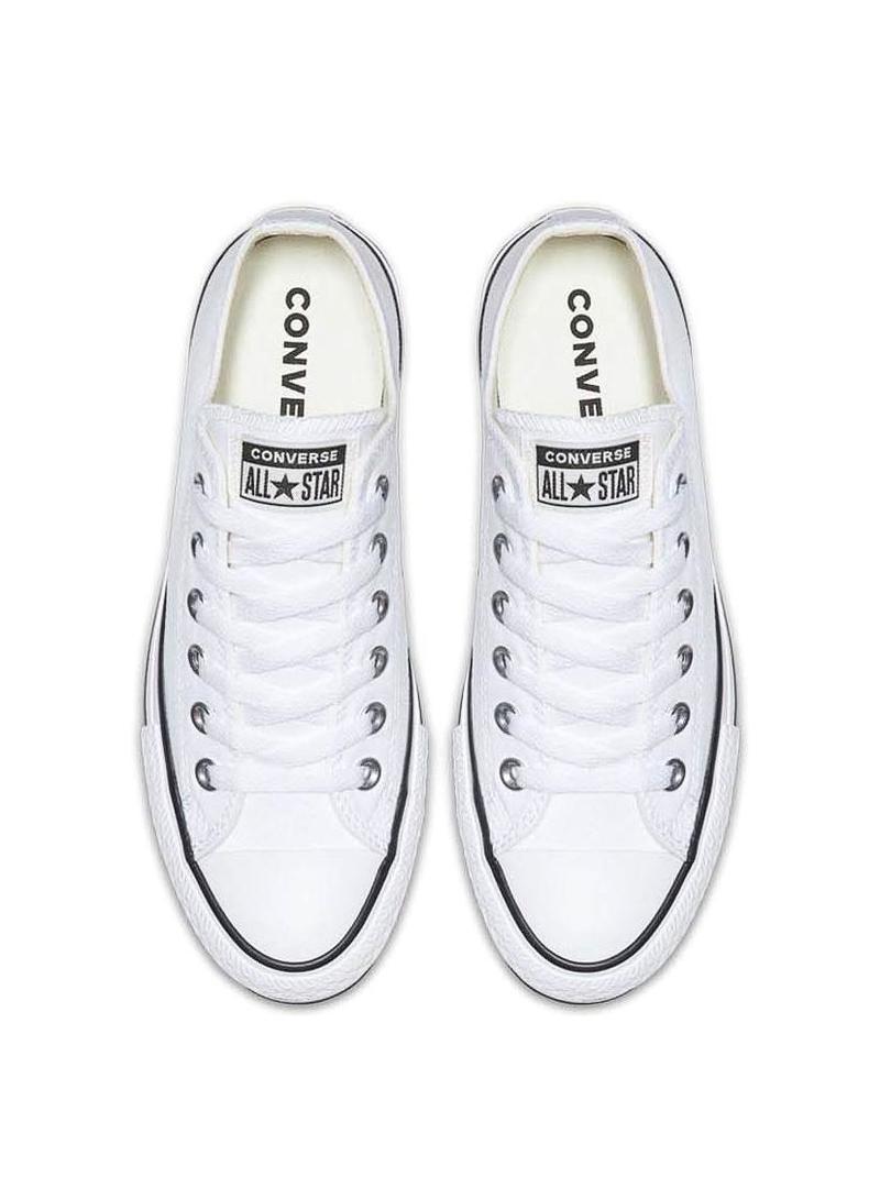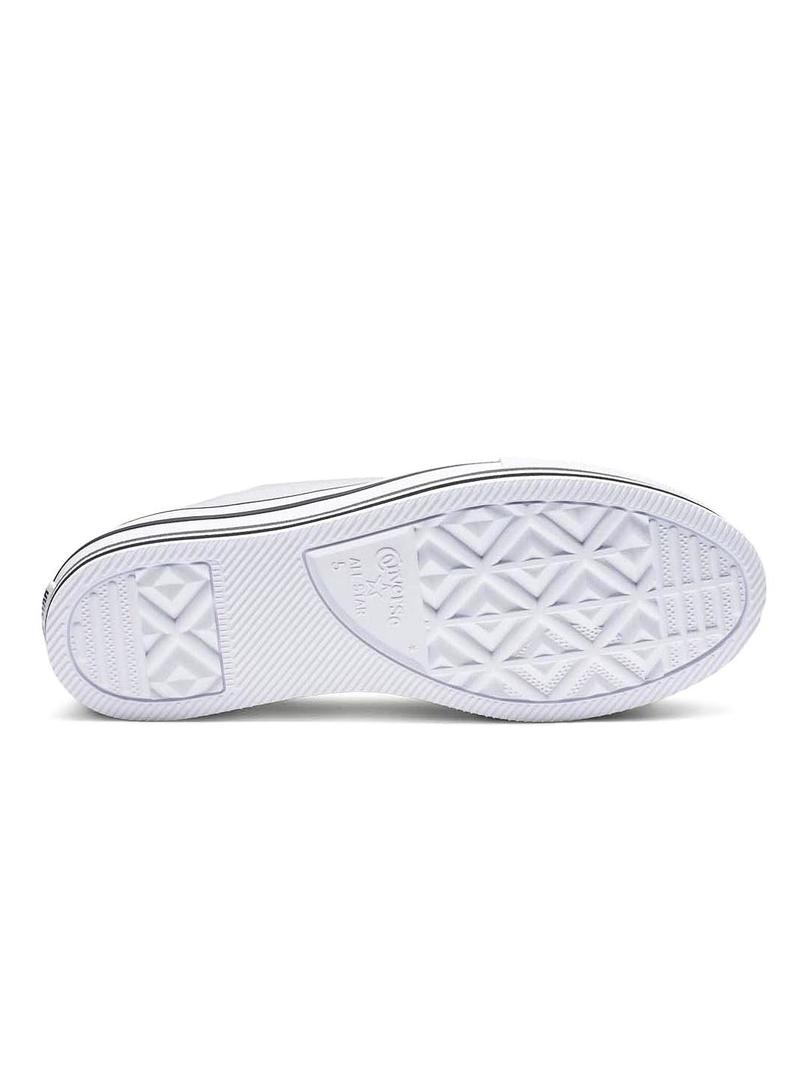 Sapatilhas Converse. Modelo Chuck Taylor All Star. Com plataforma. Cor branca. Fecho com cordões. Parte superior da lona. Corte baixo. Estes tênis geralmente esculpem grandes. Recomendamos que você encomende menos metade do tamanho.