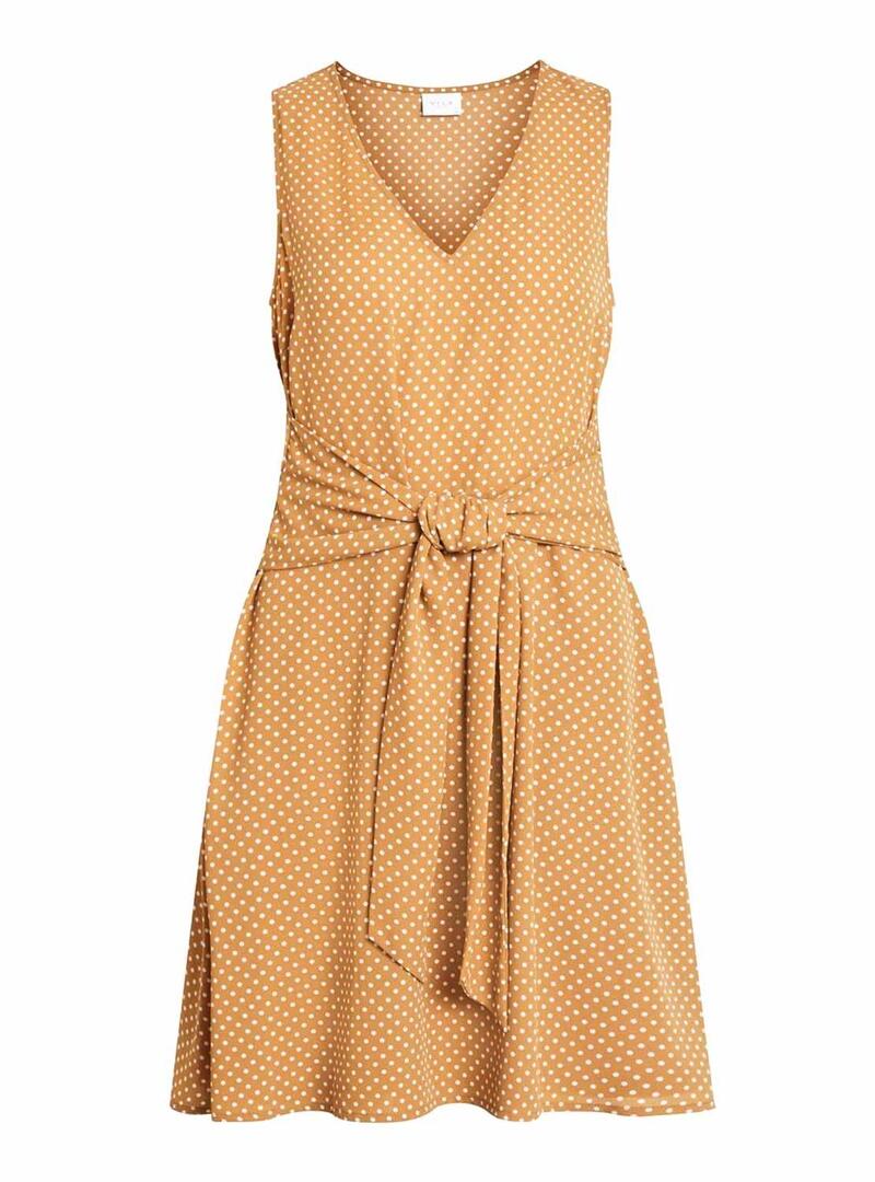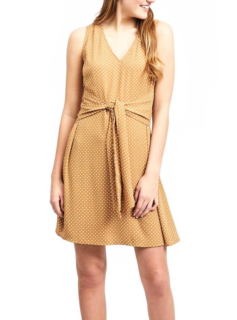 Vestido vila Modelo de Vidottia. Impressão de bolinhas. Pescoço em V. Sem mangas. Fecho de correr nas costas. Amarre detalhes na frente. O modelo usa tamanho 36.