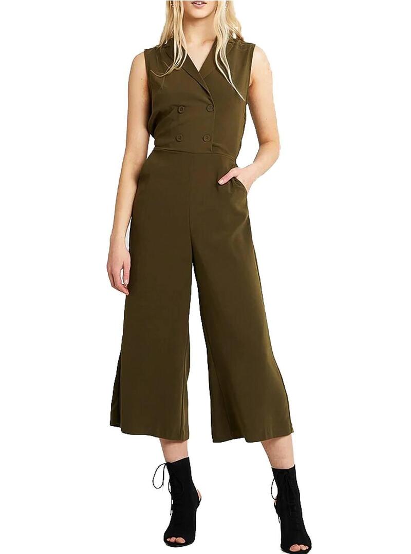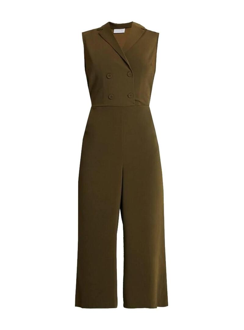 Jumpsuit Vila. Modelo de Vikaya. Cor verde. Sem mangas Estilo blazer. Formato recortado. Corte na cintura. Cruze o pescoço. Botões no peito. O modelo usa tamanho 36.