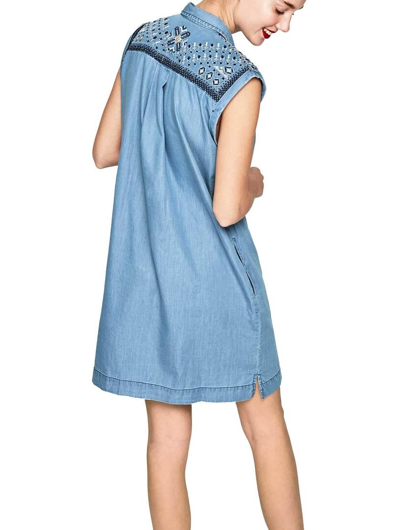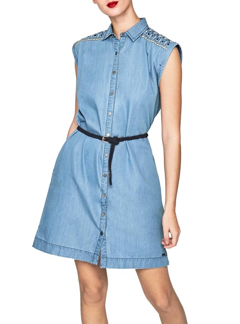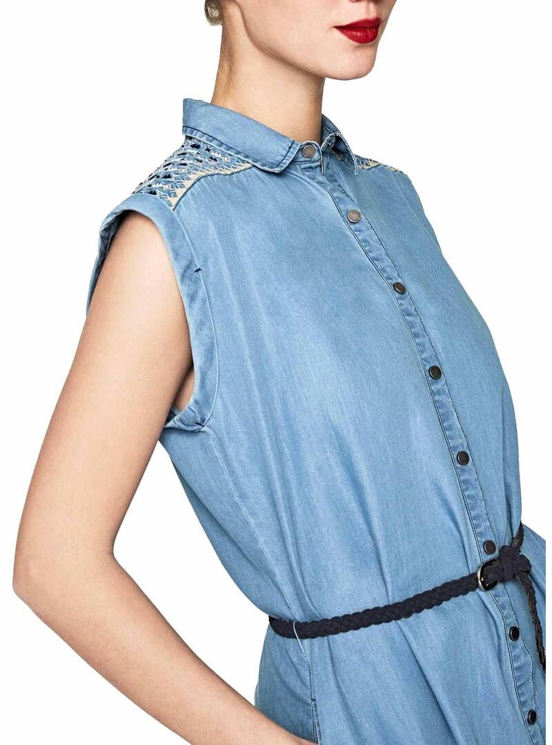 Pepe Jeans Dress Modelo Dora. Tecido denim Sem mangas Fechando os botões da frente. Colarinho camisola Cinto trançado preto. Detalhes bordados nos ombros.