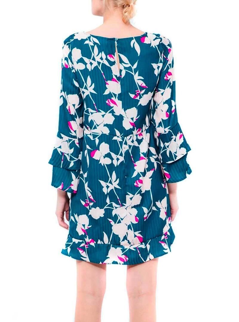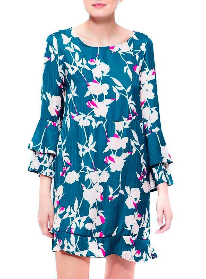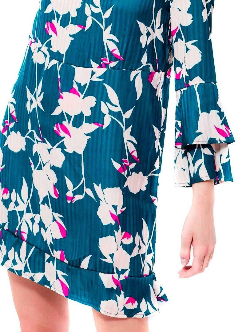 Vestido da vila Modelo Vigeeta. Pescoço redondo. Estampa floral. Cor azul. Manga comprida. Detalhe de babados nas mangas e na bainha. Ajuste solto. O modelo usa tamanho 36.