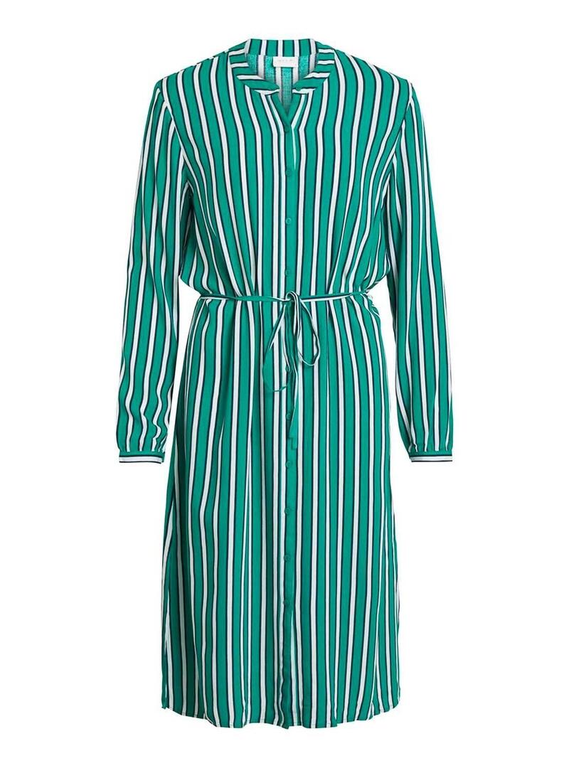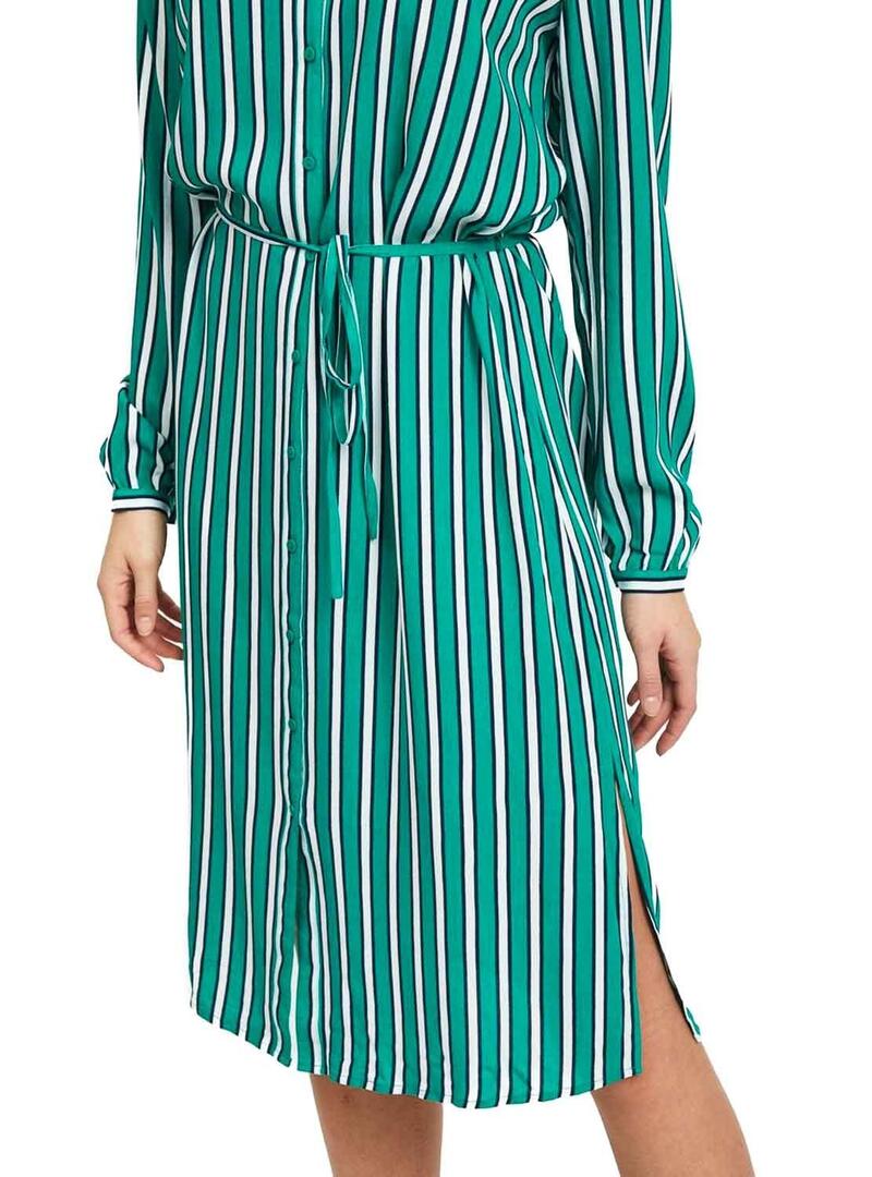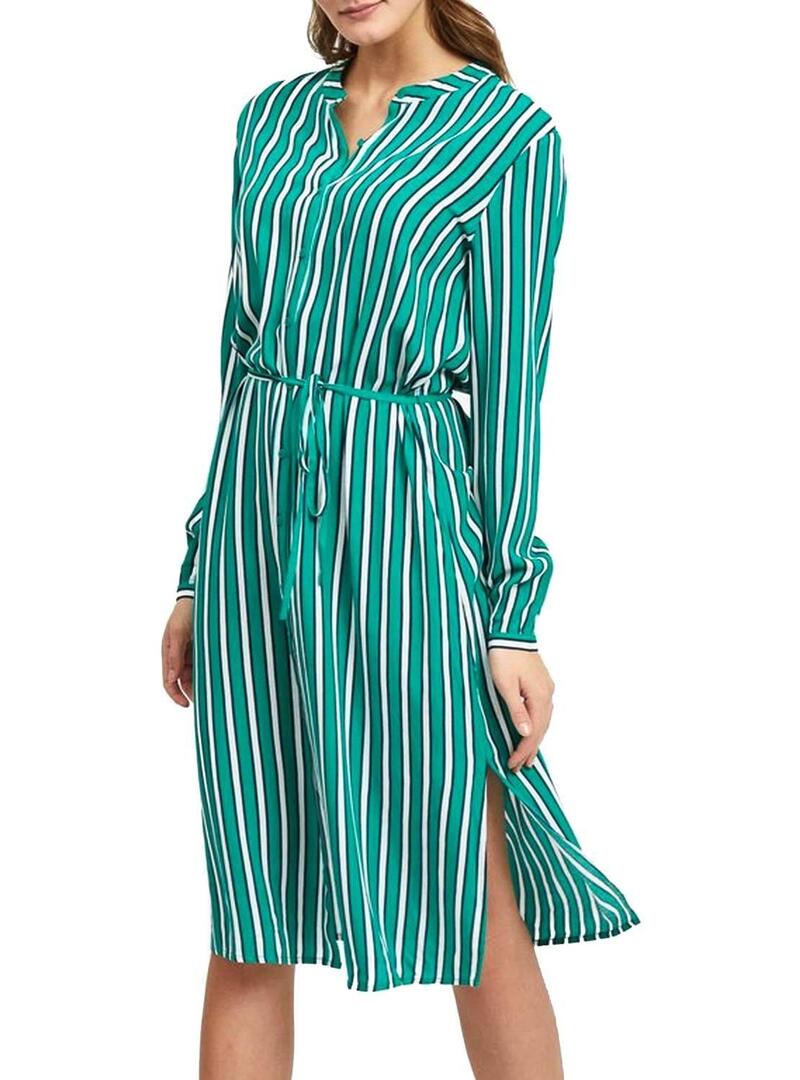 Vestido da vila Modelo Vilinetta. Cor verde. Carimbando listas. Manga comprida. Formato Midi. Cintura com cordão. . Fecho frontal com botões. Tecido leve Aberturas laterais. O modelo usa tamanho 36.