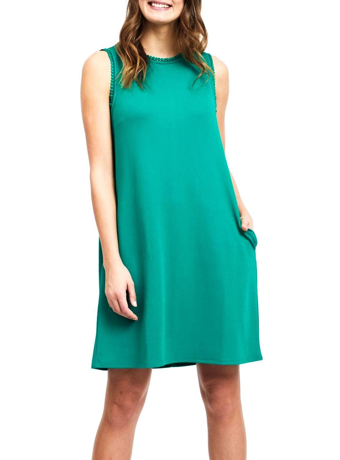 Vestido Vila. Modelo Salda. Cor verde. Sem mangas. Pescoço redondo. 2 bolsos laterais.
