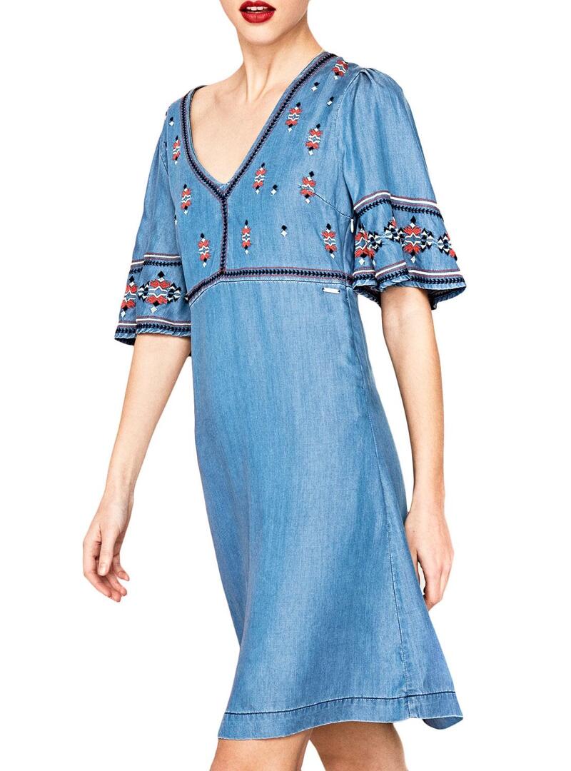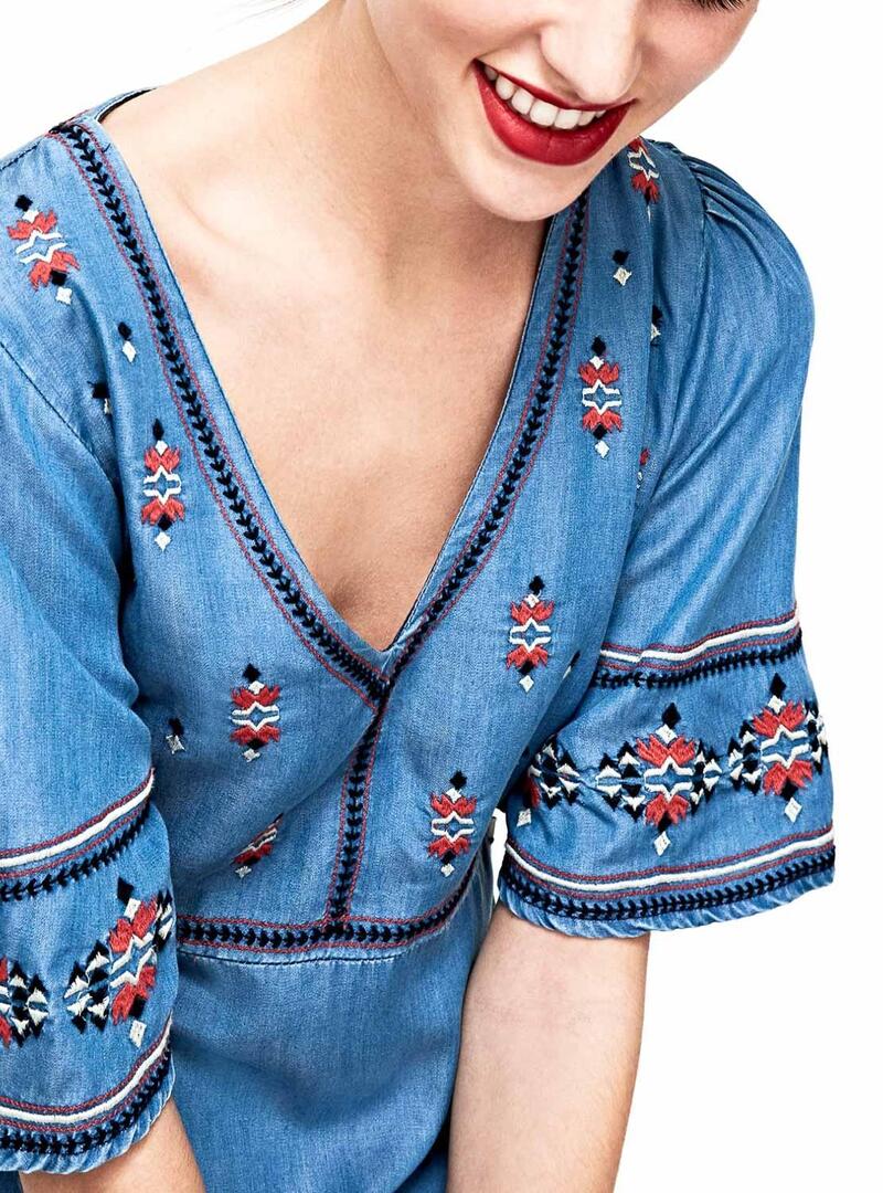 Pepe Jeans vestido. Modelo Ursula. Denim tecido mole. Manga curta com volume. Bordado Étnico Pescoço em V. Regular fit. O modelo usa tamanho S.