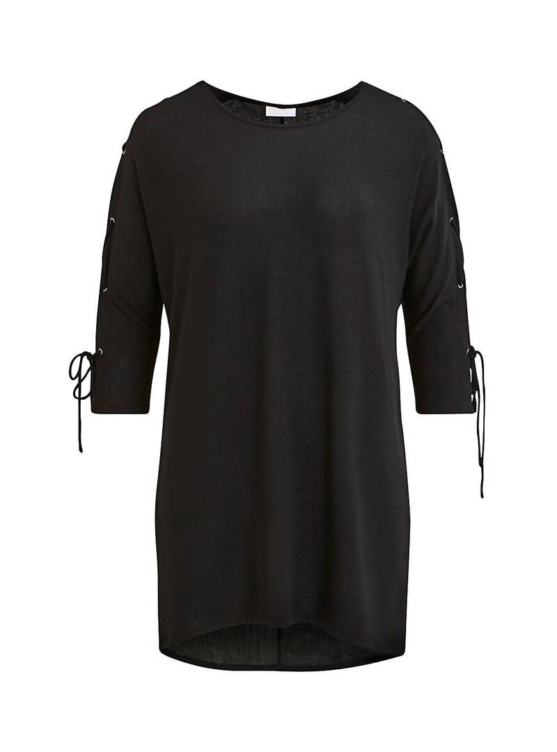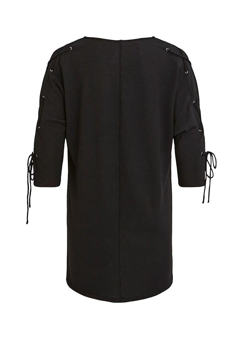 Tunica Vila. Modelo de Vilaska. Cor preta Vestido reto Pescoço redondo. Manga 3/4 Detalhe de casas de botão e laços nas mangas.