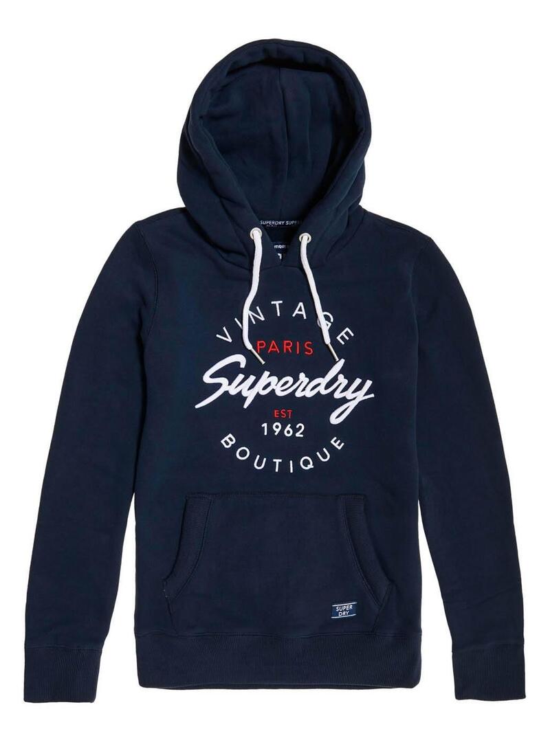 Sweat Superdry. Modelo Applique Overhead . Cor marinha Com capuz. Bolso frontal grande. Superdry na frente. Aplique a marca no seu bolso.