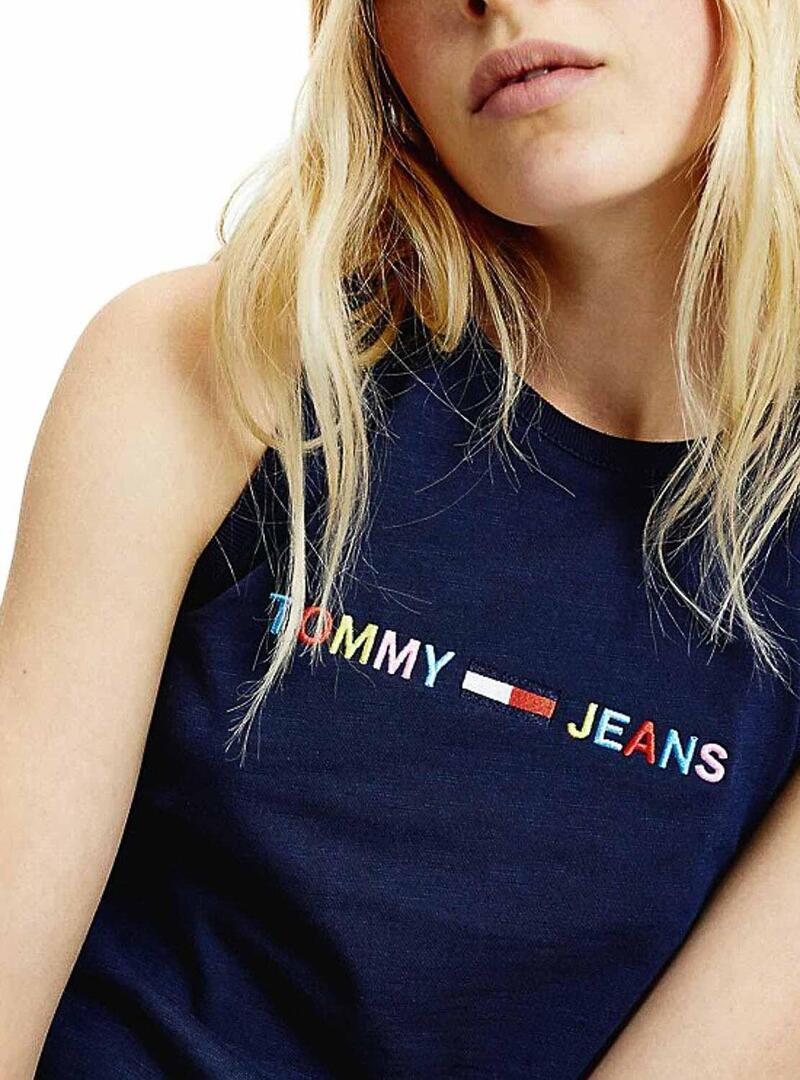 Vestido Tommy Jeans. Cor marinha. Sem mangas. Logotipo Tommy Jeans multicolorido no peito. Pescoço redondo. Detalhes distintos da marca. Regular fit. Formato midi. A modelo está usando tamanho S.