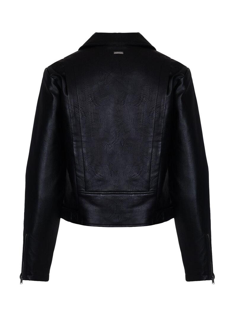 Casaca Pepe Jeans. Modelo Olga. Cor preta De ecocoiro. Detalhe laços na parte inferior. Fecho de correr Peça sobreposta nas costas. Estilo motociclista O modelo usa tamanho S.