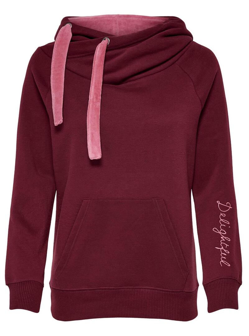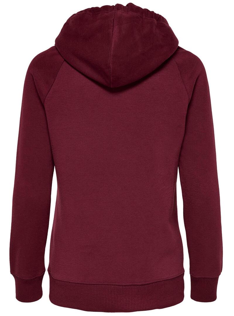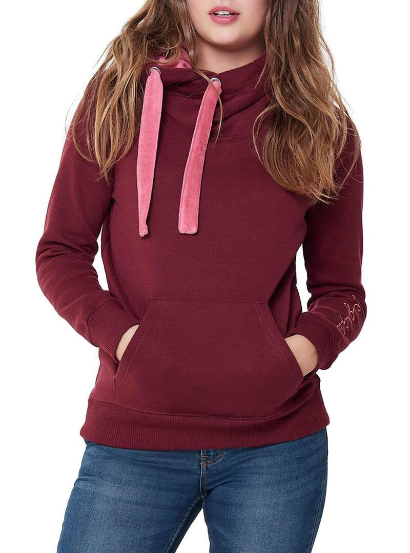 Sweat Only. Modelo de jasmim. Cor granada. Com capuz. Bolso frontal grande. Detalhe bordado na manga. Regular fit O modelo usa tamanho S.