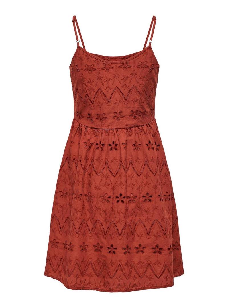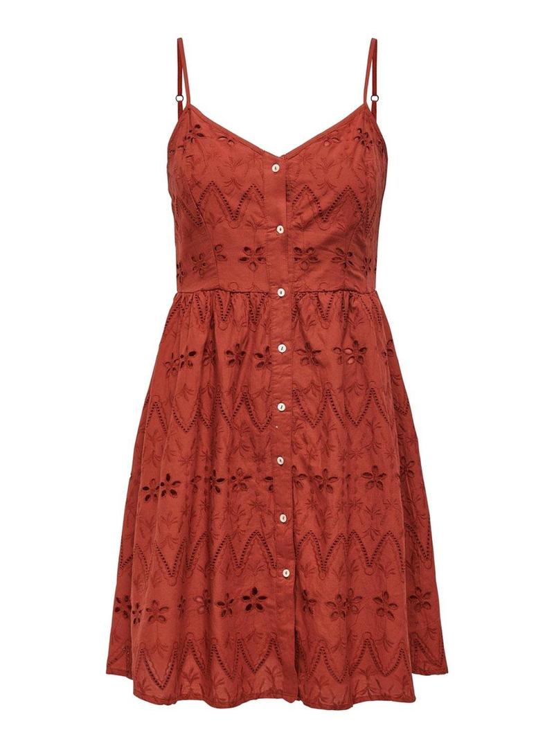 Vestido Only. Modelo Siri. Cor de telha laranja. Tecido bordado com céu aberto. Decote em V. Correias ajustáveis. Mini comprimento. Saia queimada. Fecho com botão frontal.