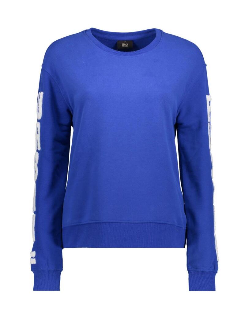 Sweat Only. Modelo Anna Cor azul. Pescoço redondo. Detalhe em mangas. Bordas com nervuras.