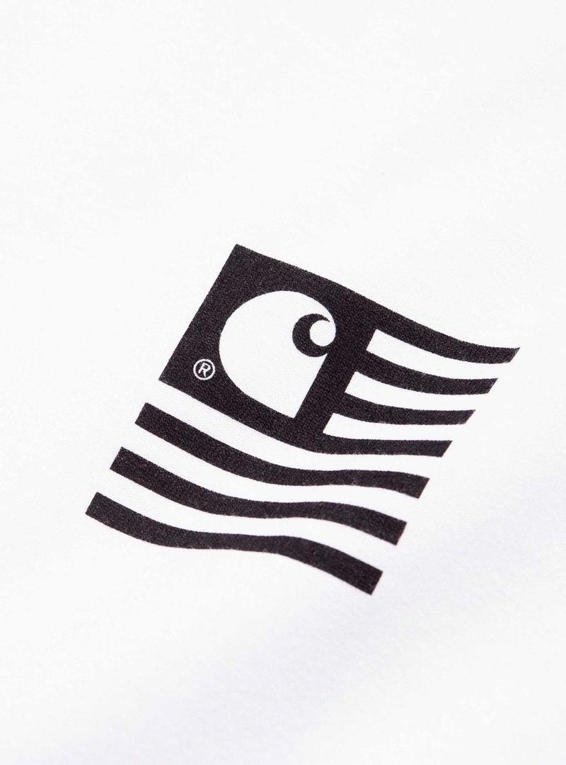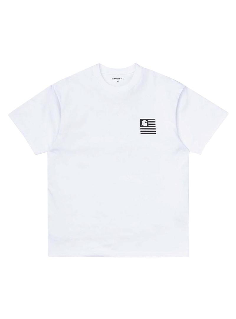 T-Shirt Carhartt. Cor branca. Pescoço redondo. Manga curta. Marca de impressão no peito. Patch de popeline impresso nas costas. Ajuste solto.