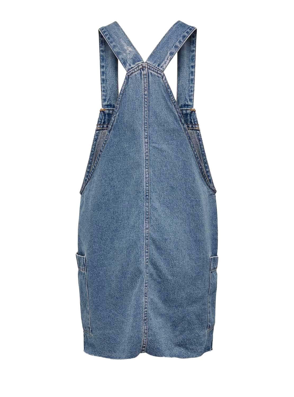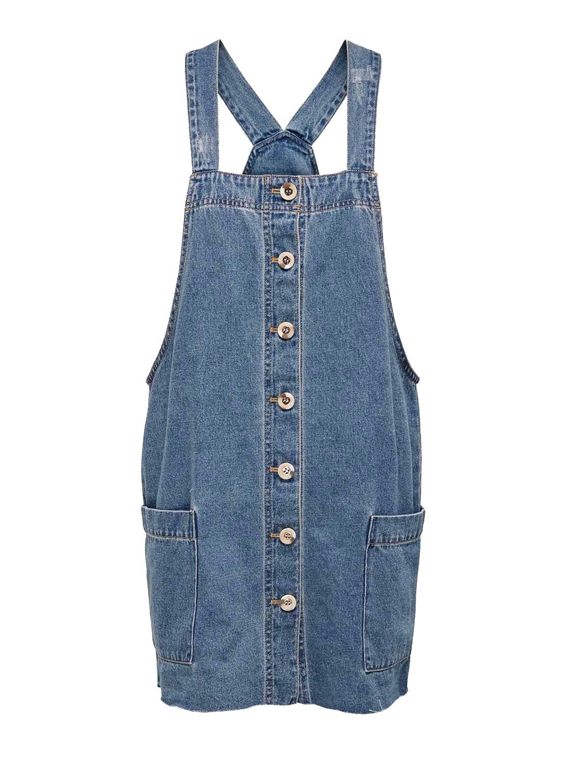 Vestido Only. Modelo Melisandre. Jeans médio. Babete. Fecho de botão. Corte reto. Bolsos laterais.