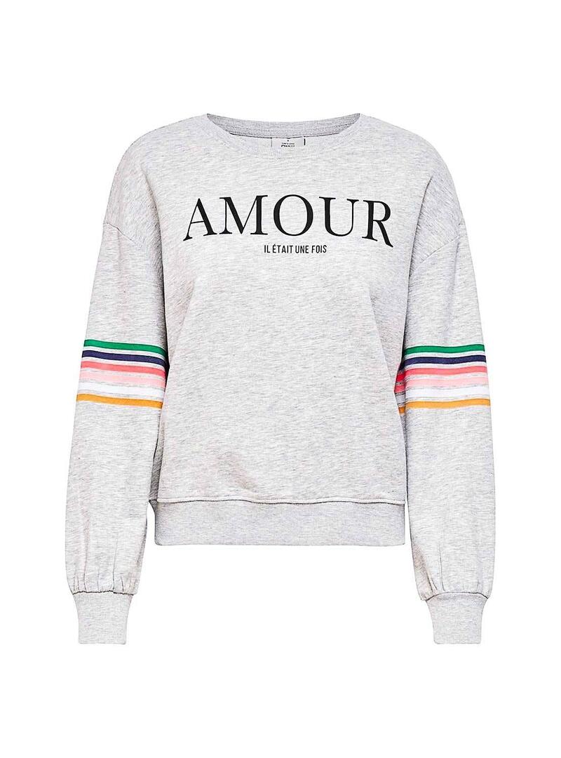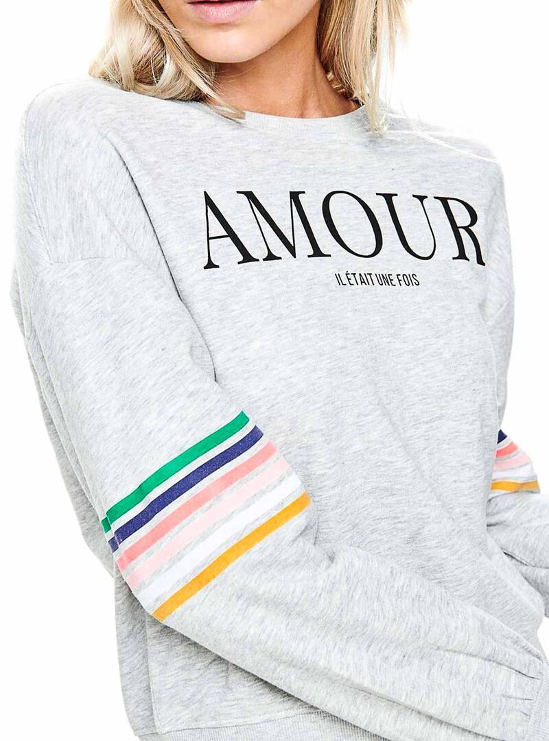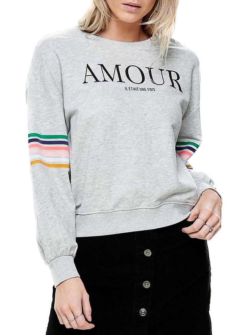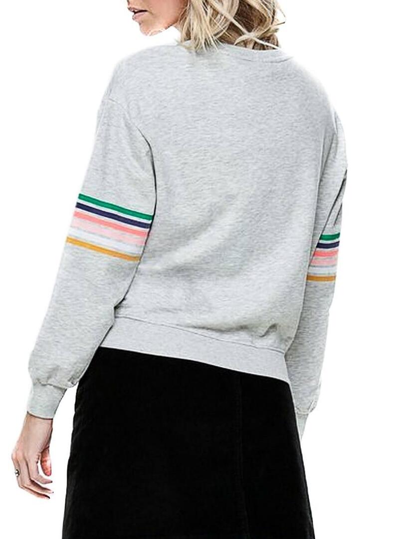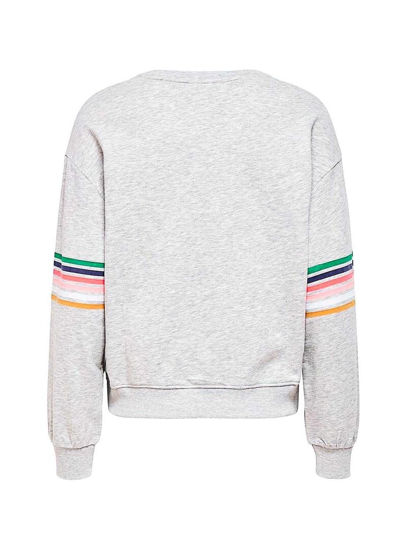 Sweat Only. Modelo Daisy. Cor cinzenta. Manga comprida. Pescoço redondo. Linhas coloridas nas mangas. Texto estampado na frente.