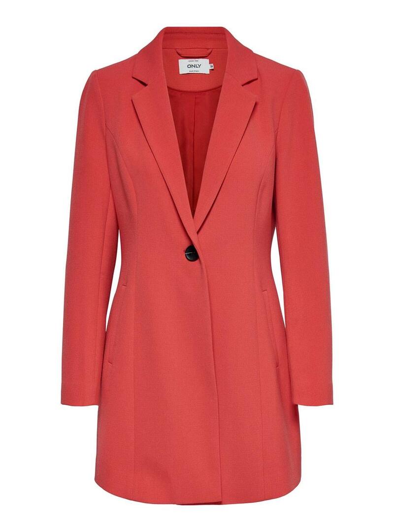 Blazer Only. Modelo Savannah. Cor vermelha. Feche com um botão. Regular fit Manga comprida. Dois bolsos laterais. Muito acima do joelho.