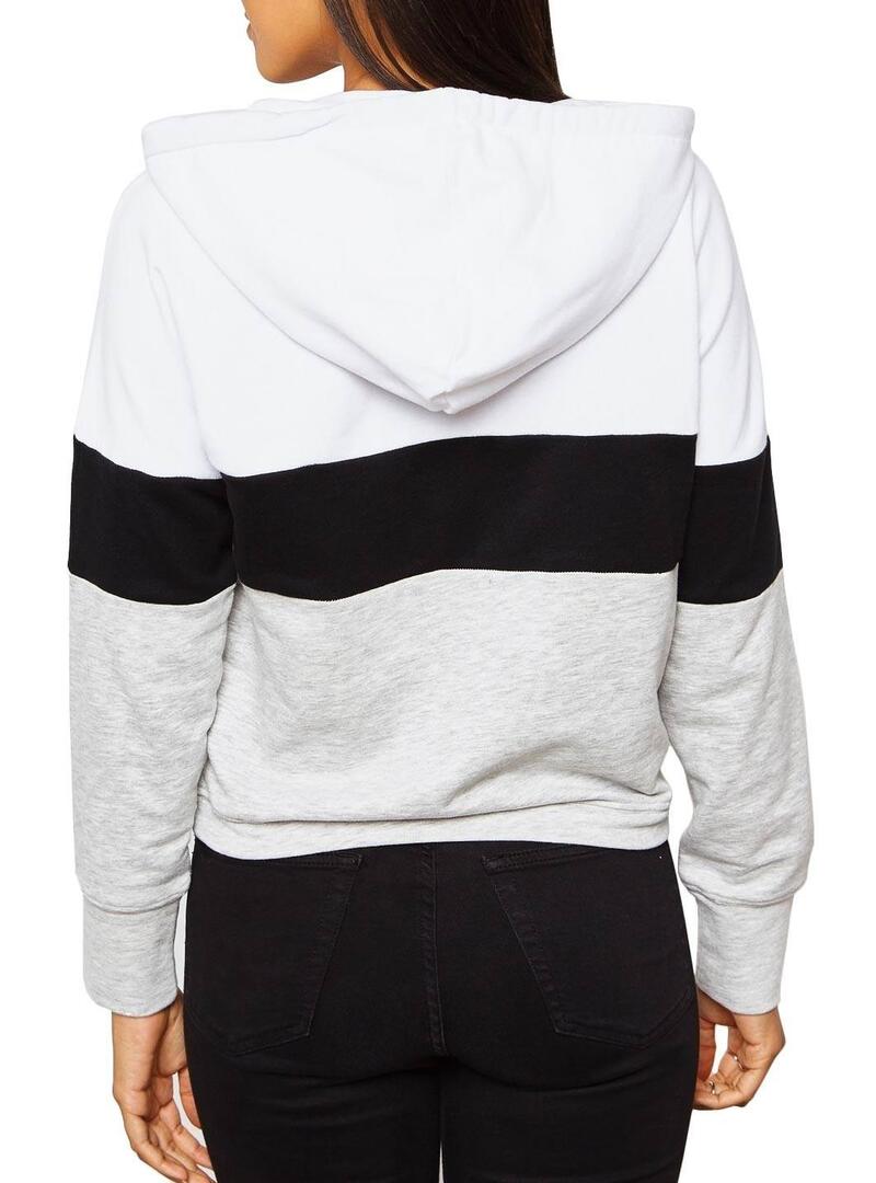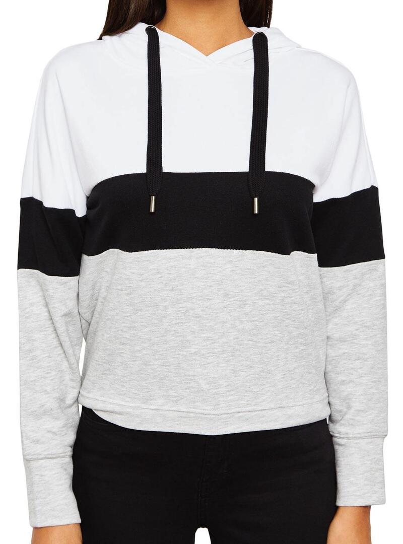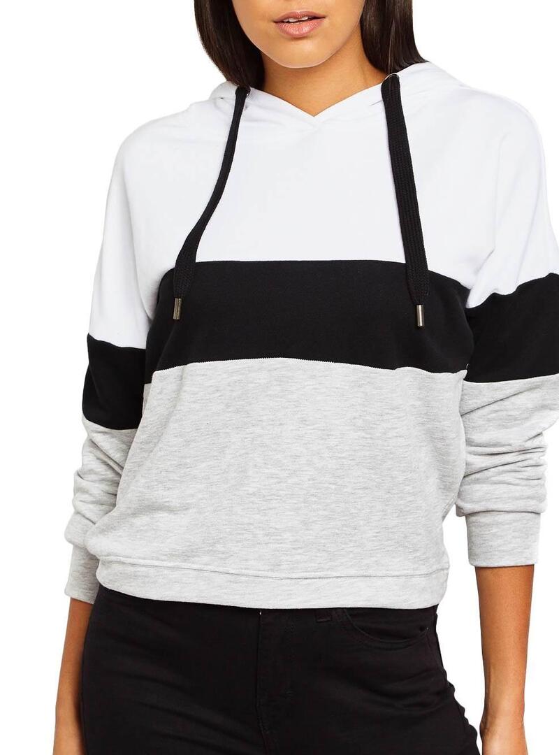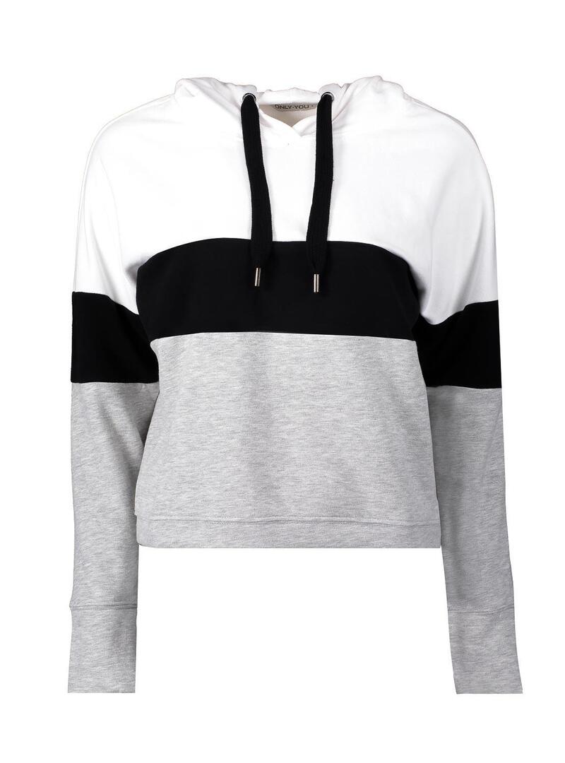 Sweat Only. Modelo Dorit Block. Cor cinzenta. Manga comprida. Capuz ajustável com cordão. Top em branco. Fundo em cinza. Linha de contraste preto.