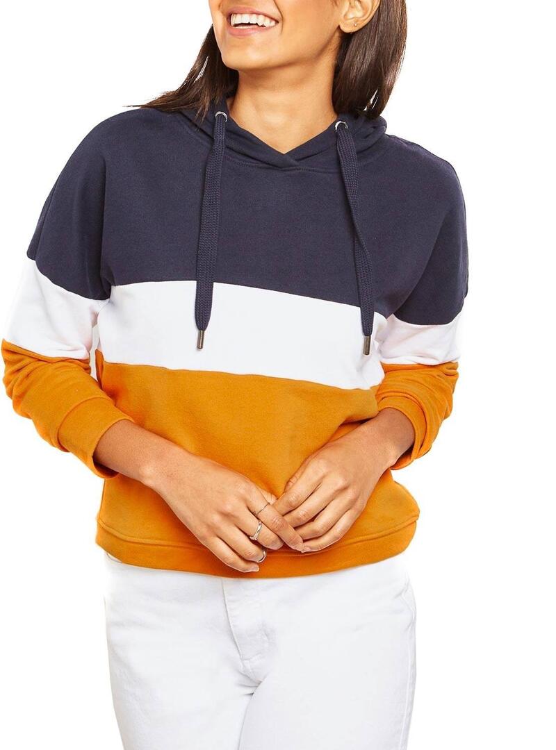 Sweat Only. Modelo Dorit Block. Cor amarela. Manga comprida. Capuz ajustável com cordão. Parte superior na cor marinha. Fundo em amarelo. Linha de contraste branco.