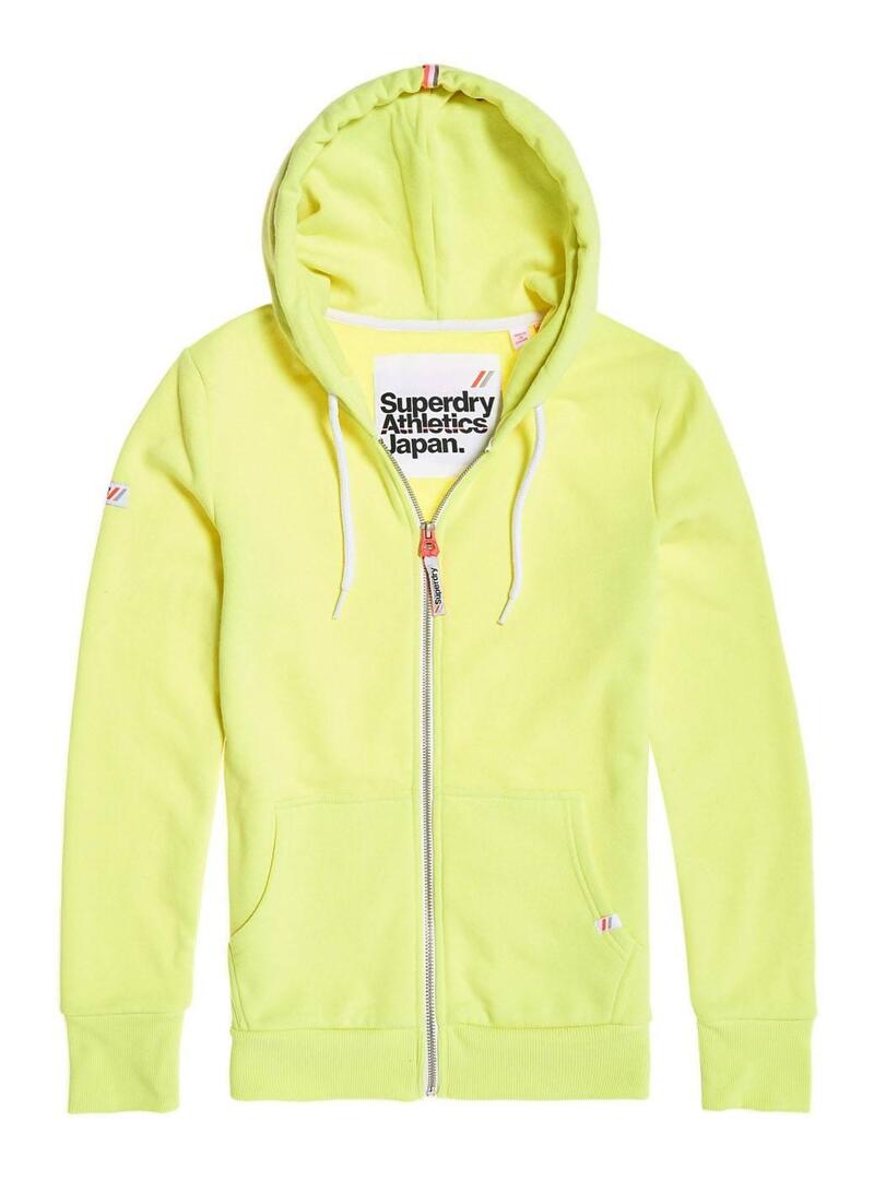 Sweat Superdry. Modelo de Ziphood de LA Athletic. Cor limão com capuz Fecho de correr Dois bolsos frontais Superdry etiqueta em uma luva.