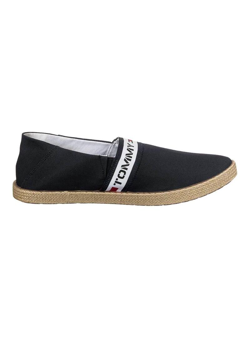 Alpercatas Jeans Tommy. Modelo de soma. Cor preta. Sola antiderrapante em juta. Parte de cima têxtil. Fita do logotipo no peito do pé.