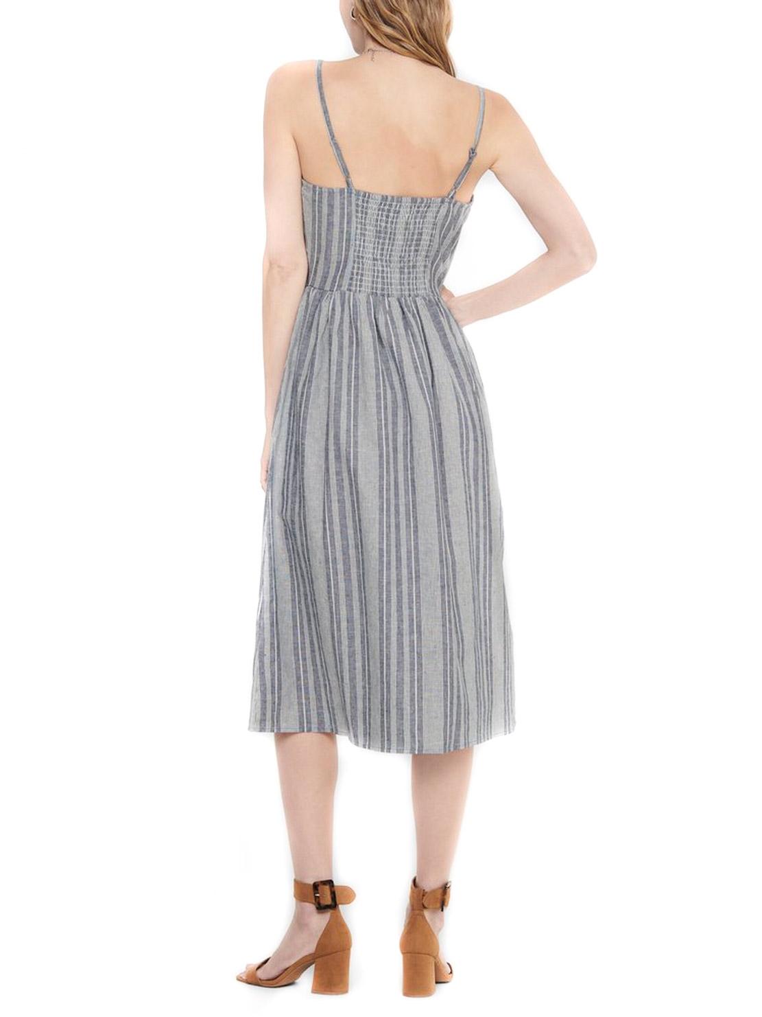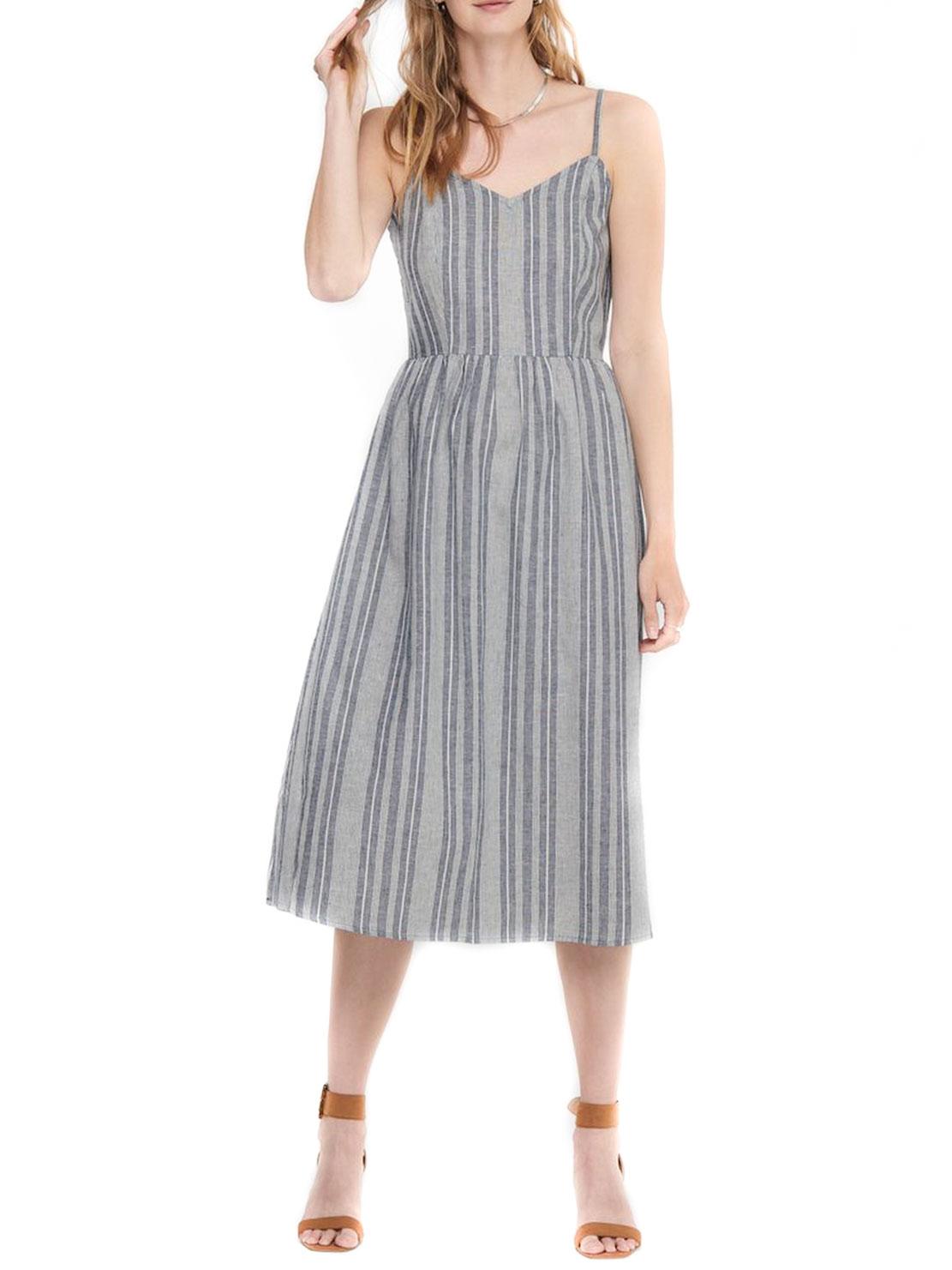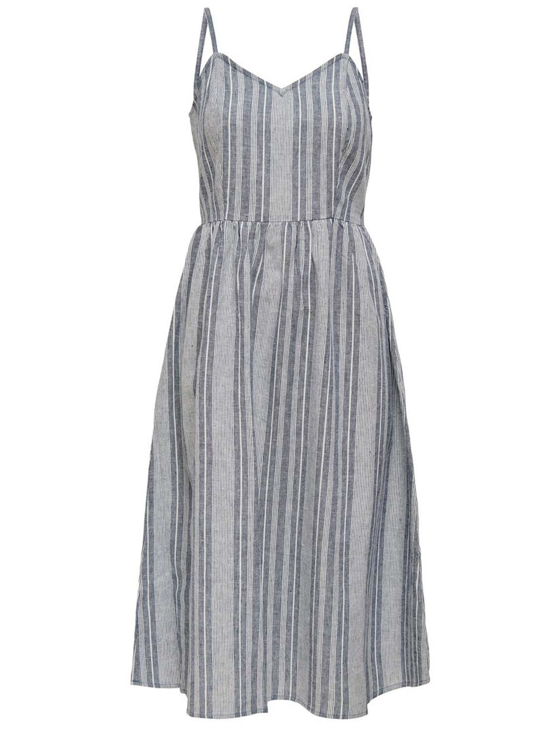 Vestido Only. Modelo Vivian. Cor azul. Decote em V. Parte de cima ajustado. Saia com voo. Comprimento midi. Impressão listrada branca.