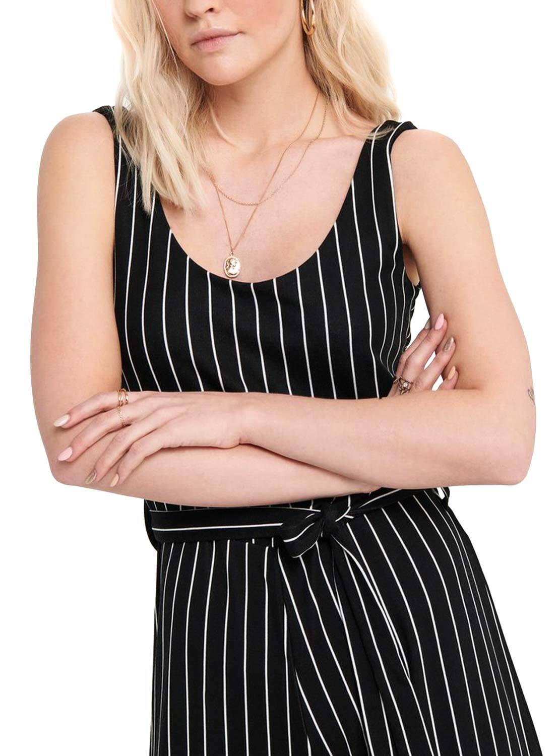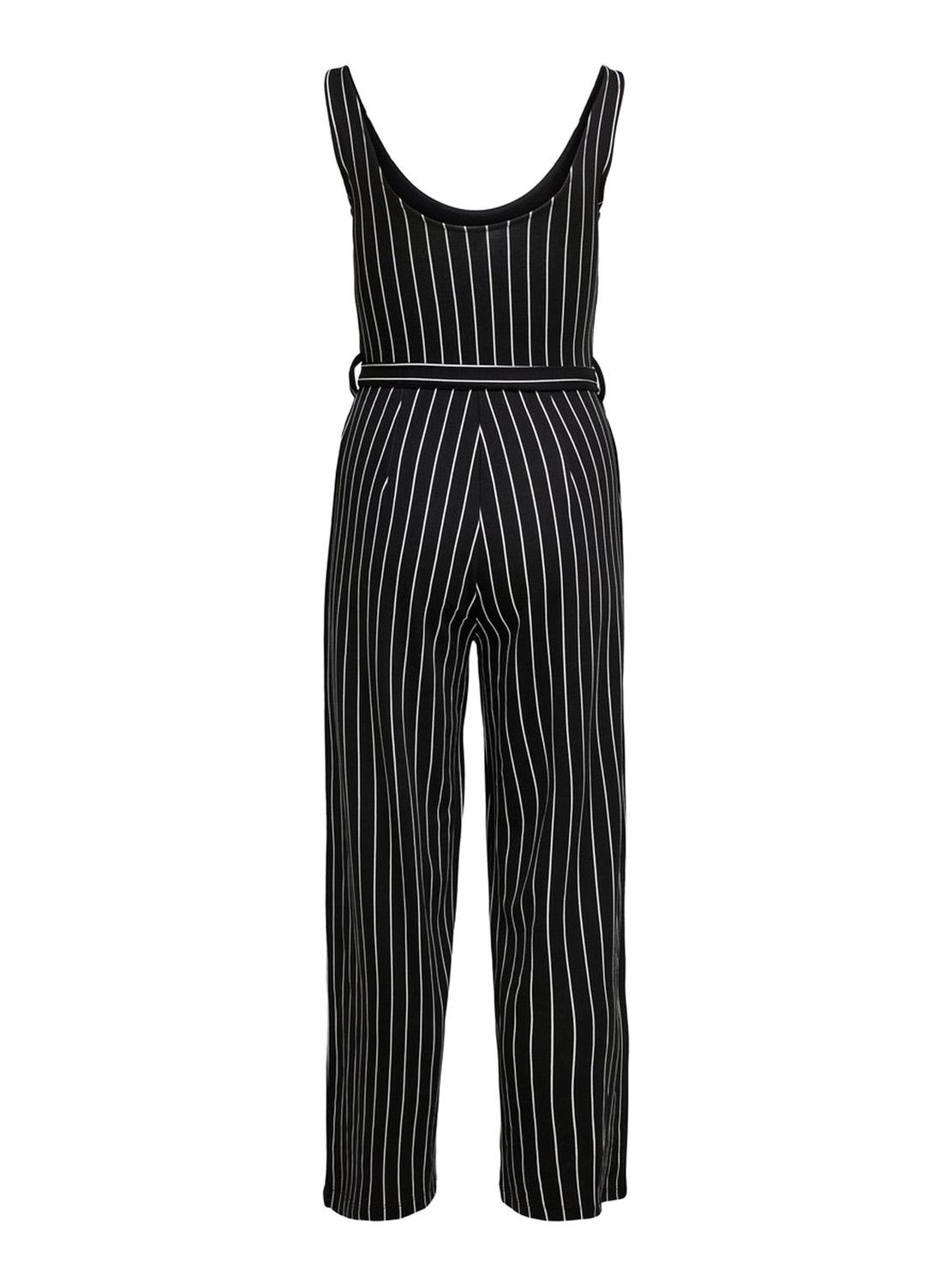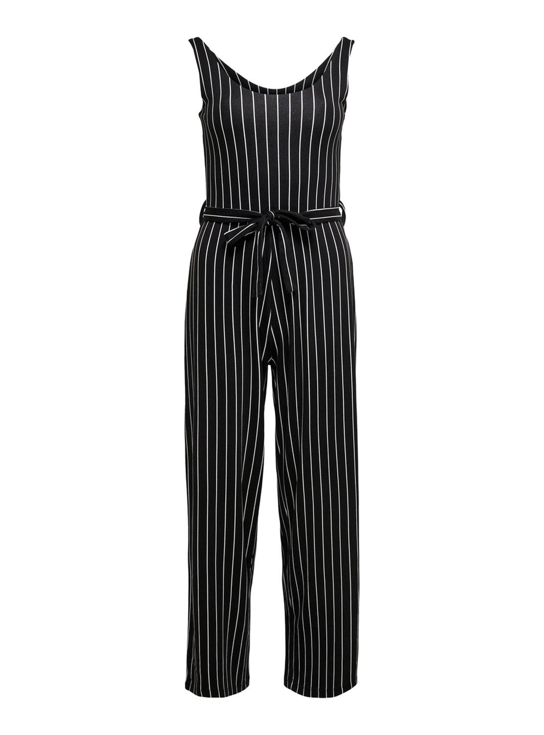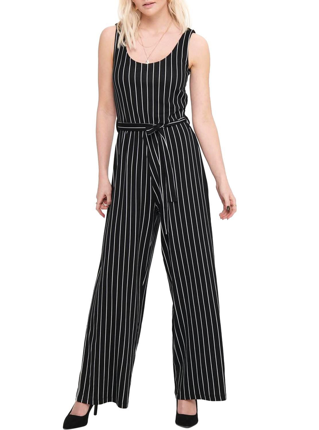 Jumpsuit Only. Modelo Felia. Cor preta. Impresso com listras brancas verticais. Decote redondo. Armhole manga. Fundo largo. Comprimento do tornozelo. Cinto ajustável.