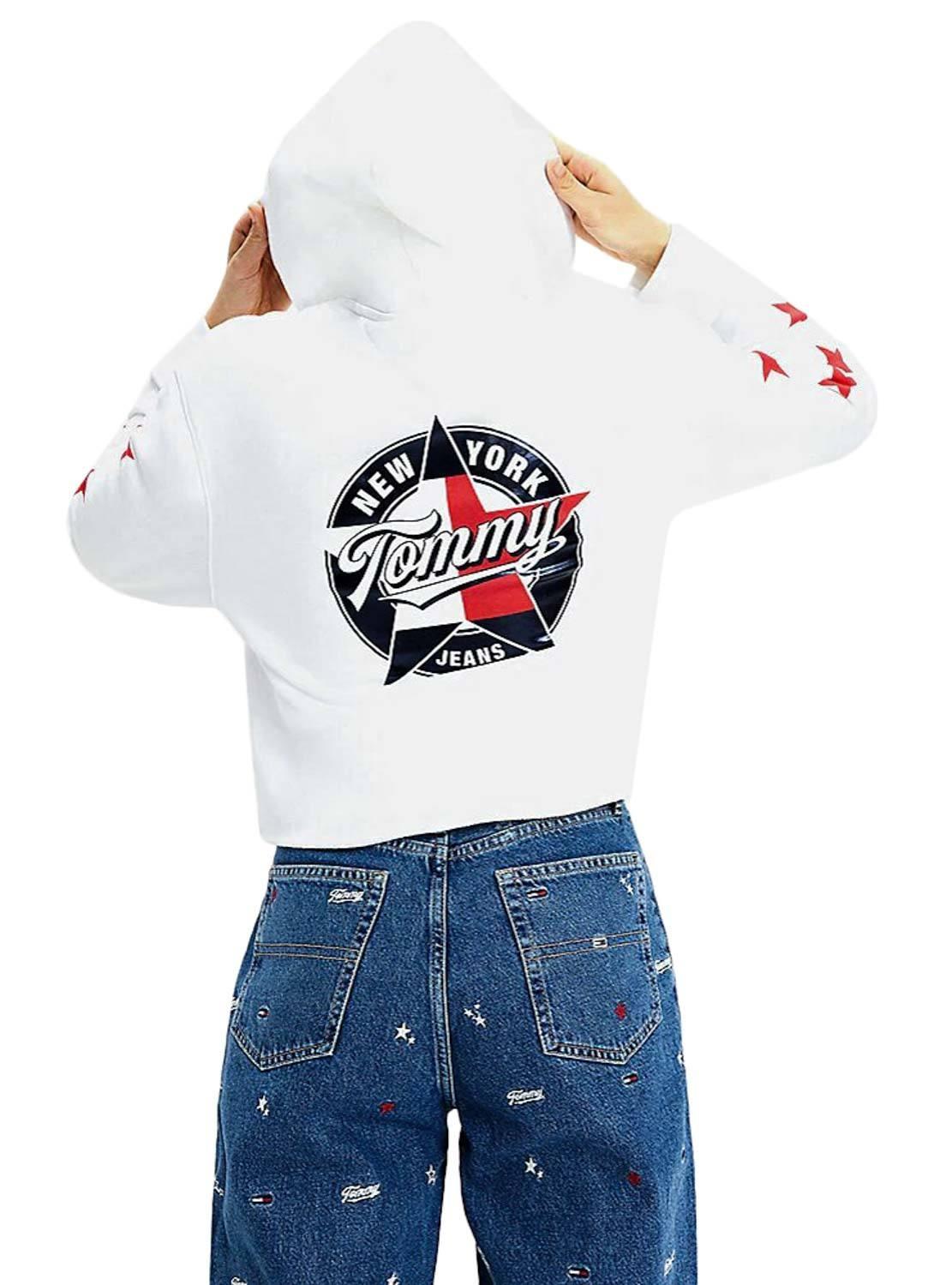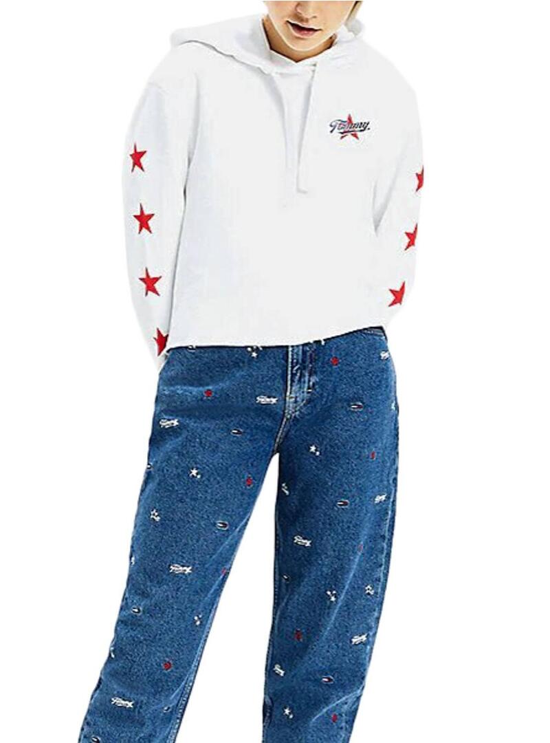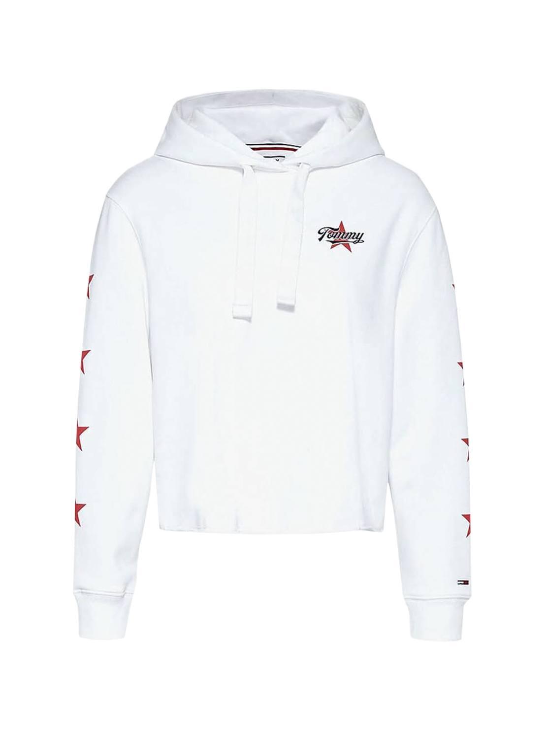 Sweat Tommy Jeans. Modelo Modern Logo. Cor branca. Corte quadrado. Capuz com cordão. Extremidades elásticas. Impressão do logotipo no peito. Estrelas impressas nas mangas. Logotipo circular impresso na parte de trás.