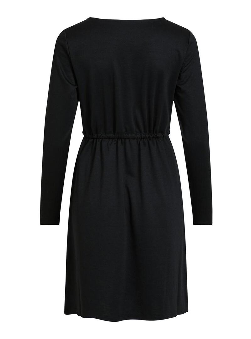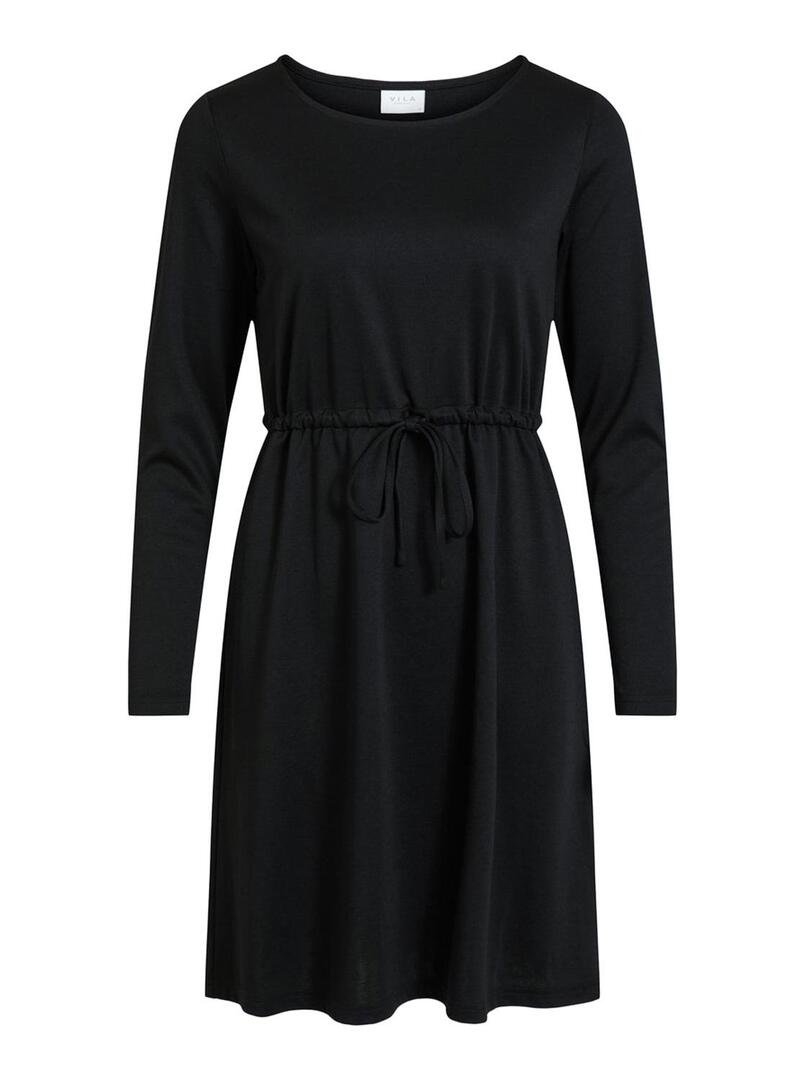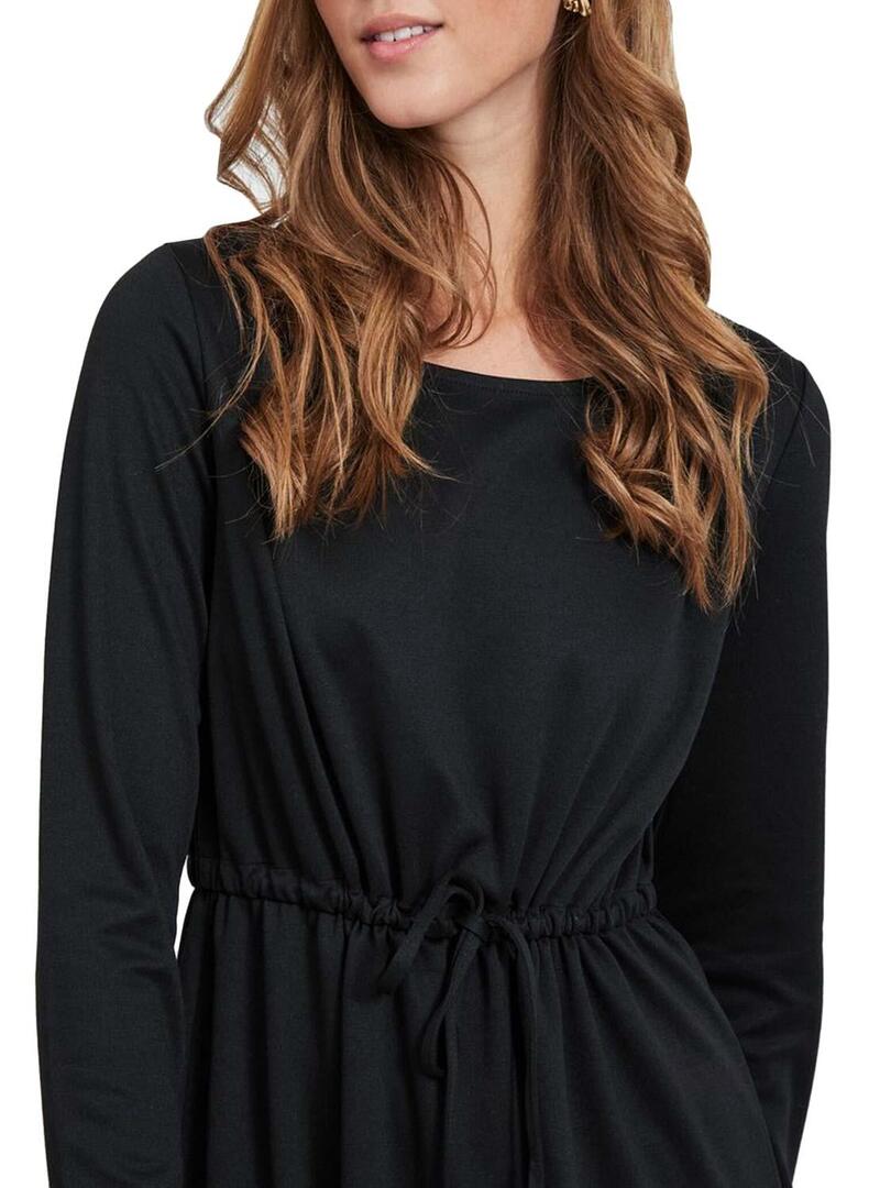 Vestido Vila. Modelo Juner. Cor preta. Manga comprida. Decote redondo. Cintura ajustável. Material leve e elástico. A modelo está usando tamanho M.