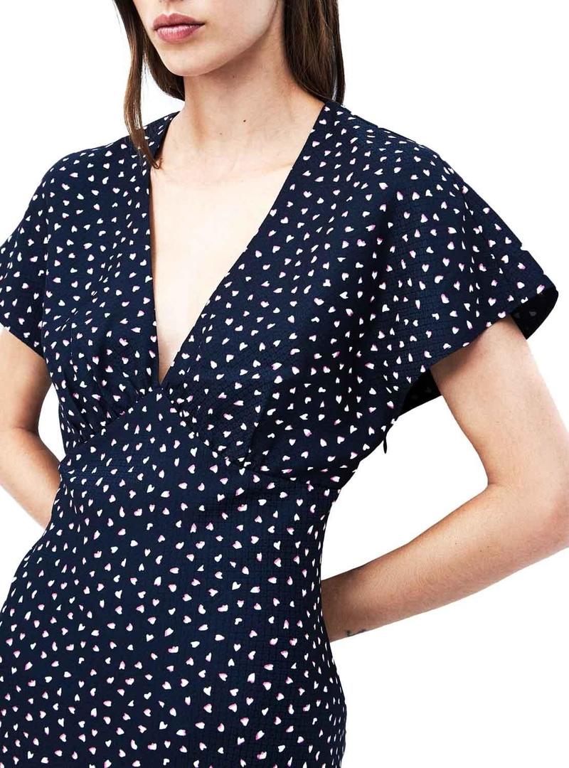 Vestido Pepe Jeans. Model Sara. Cor marinha. Manga curta. Decote em V. Impresso em branco.