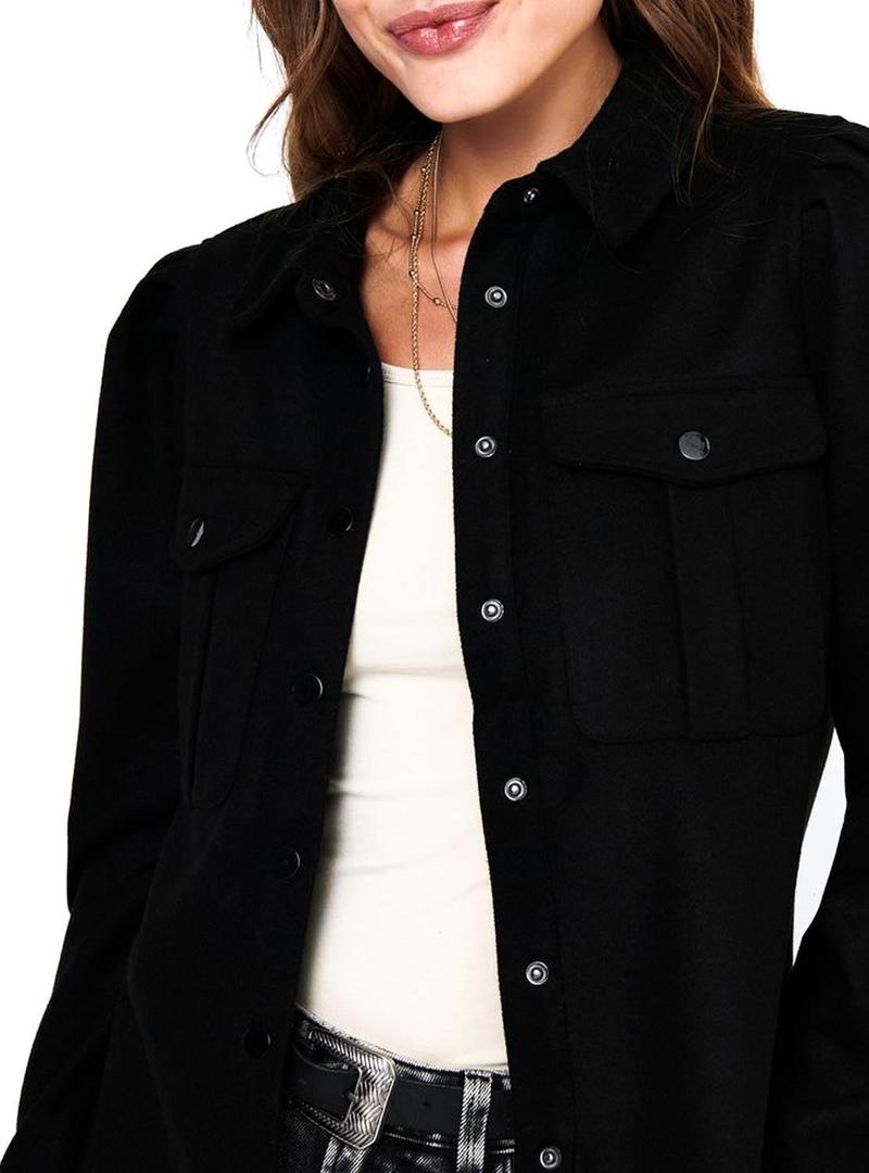 Camisa Only. Modelo Eilena. Mangas compridas bufantes. Tecido com lã. Cor preta. Fecho com botão frontal. Dois bolsos no peito com abas e botões. A modelo usa um tamanho 36.