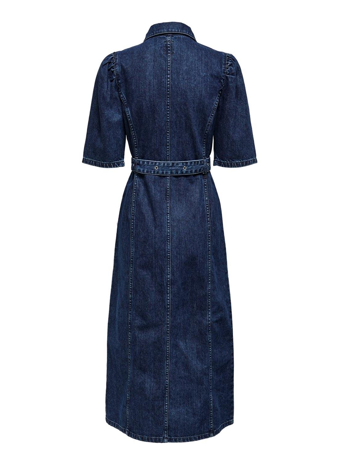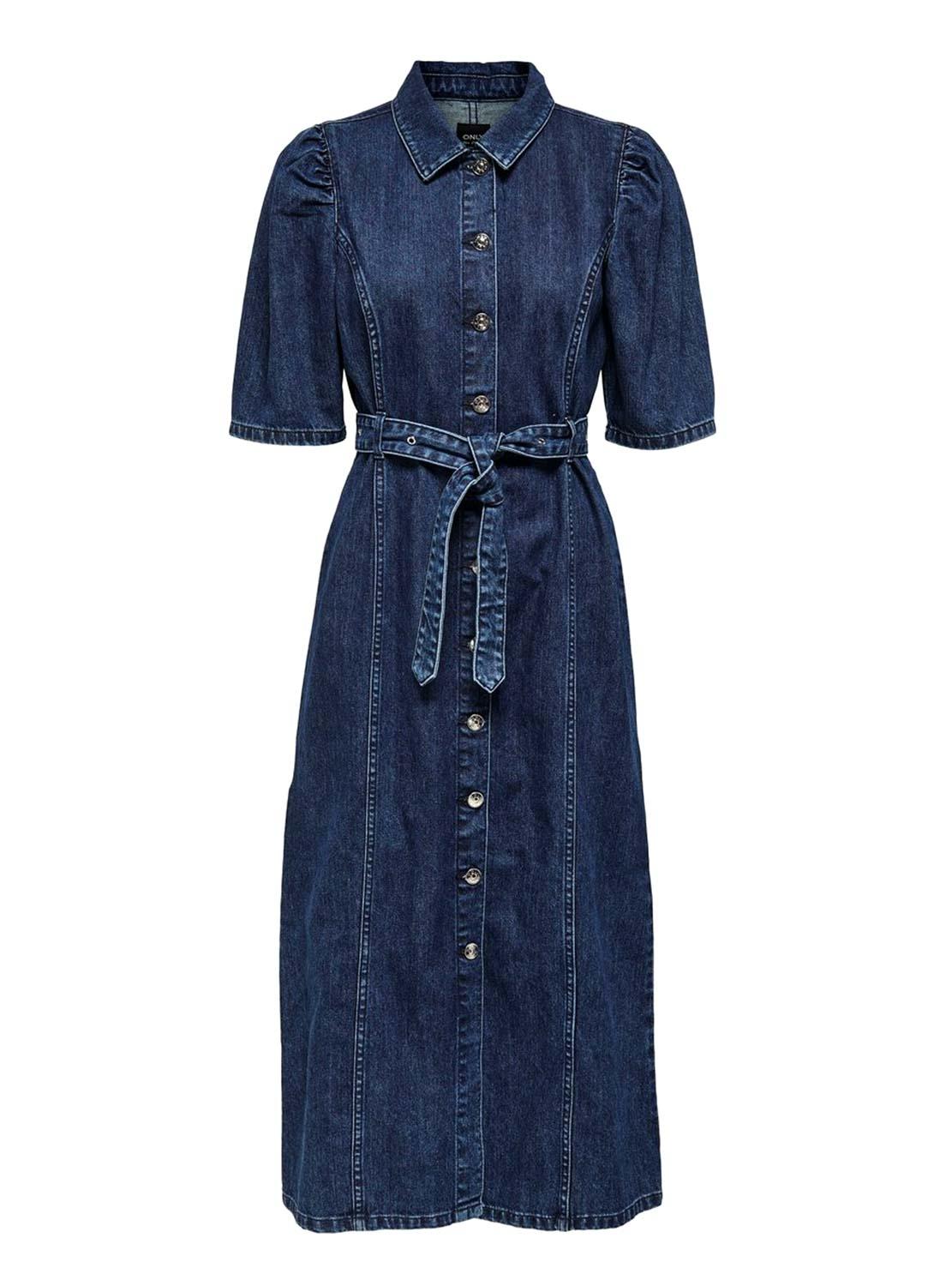 Vestido jeans Only. Com mangas bufantes. Fecho de botões à frente. Gravata ajustável na cintura. Comprimento do midi. Lavagem escura. A modelo usa tamanho S.