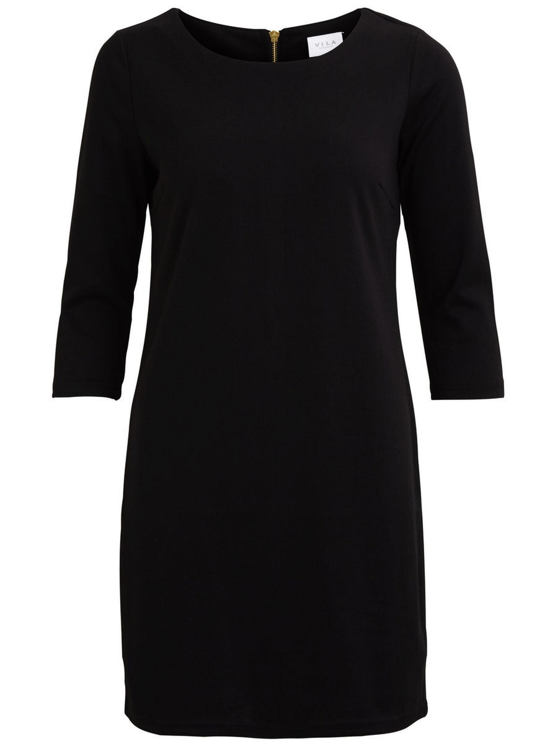 Vila vestido. modelo Vitinny. cor preta. em torno do pescoço. 3/4 de luva. Regular fit. Zíper na parte de trás. O modelo usa tamanho S.