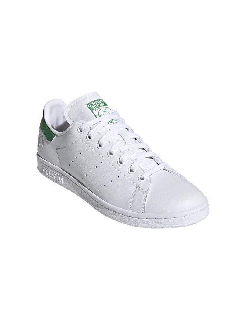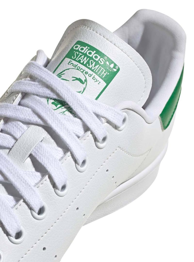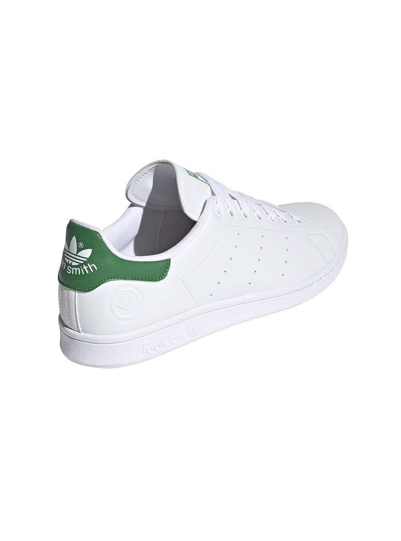 Sapatilhas Adidas. Modelo de Stan Smith. Cor branca. Detalhes em verde. Sola antiderrapante borracha. Fecho com cadarço. Marca gravada no calcanhar. Perfurações formando os três Listras emblemáticos. Feito de couro vegano.