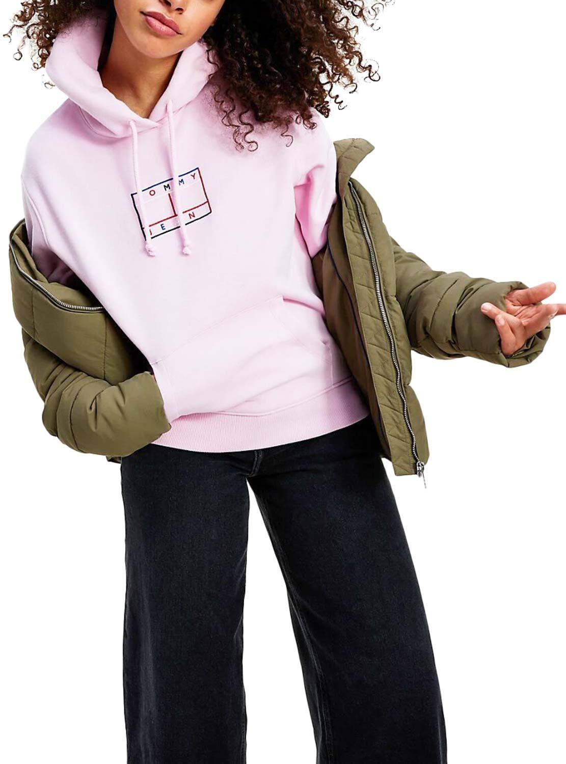 Sweat Tommy Jeans. Modelo Outline. Cor rosa. Capuz com cabo ajustável. Impressão do logotipo no peito. Bandeira bordada na manga. Extremidades com nervuras. Ombros caídos.