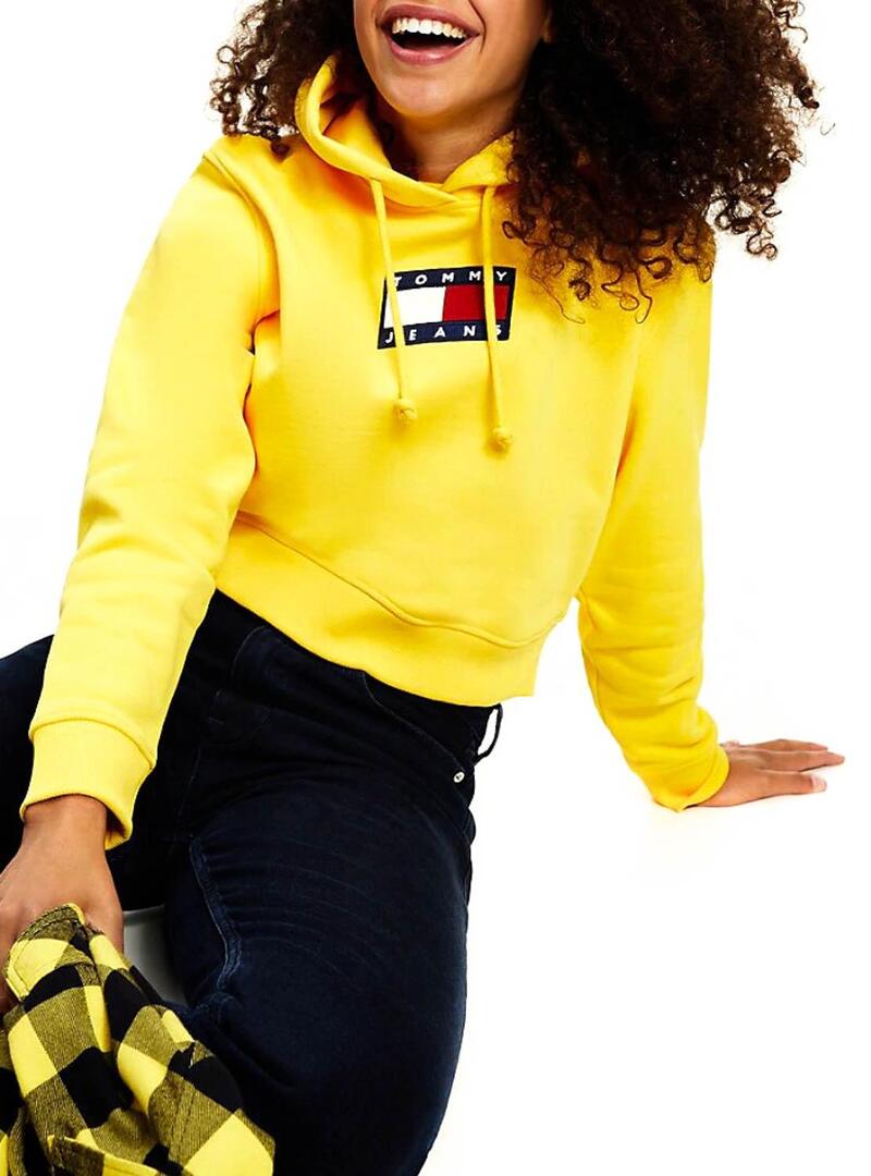 Sweat Calça jeans Tommy. Cor amarela. Corte recortado. Ajuste amplo. Capuz com atacadores. Logótipo bordado no peito. Extremidades com nervuras.