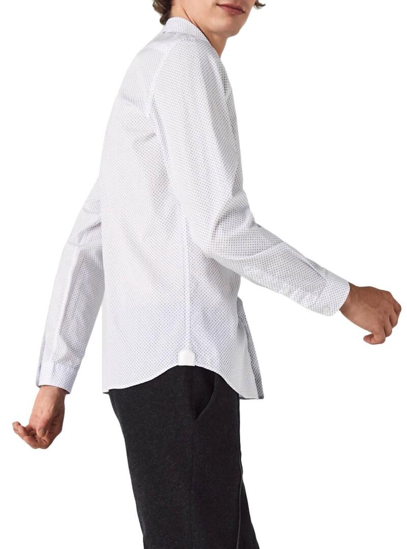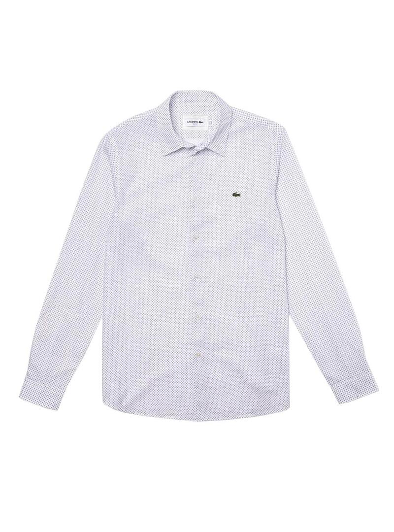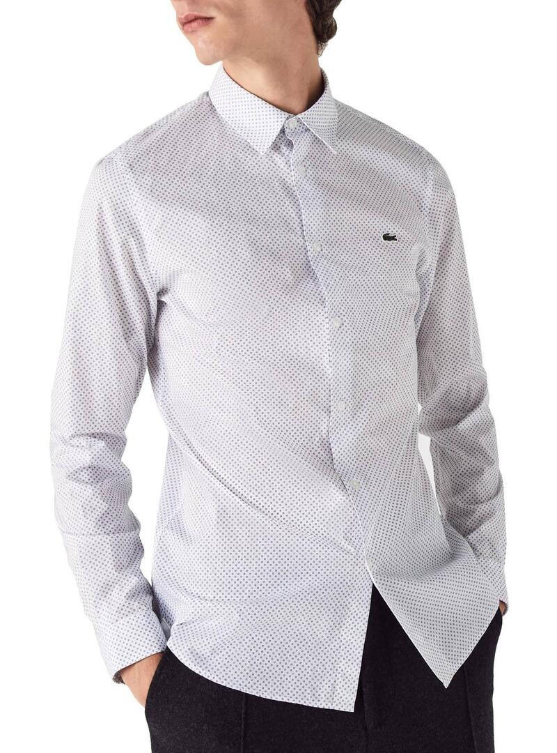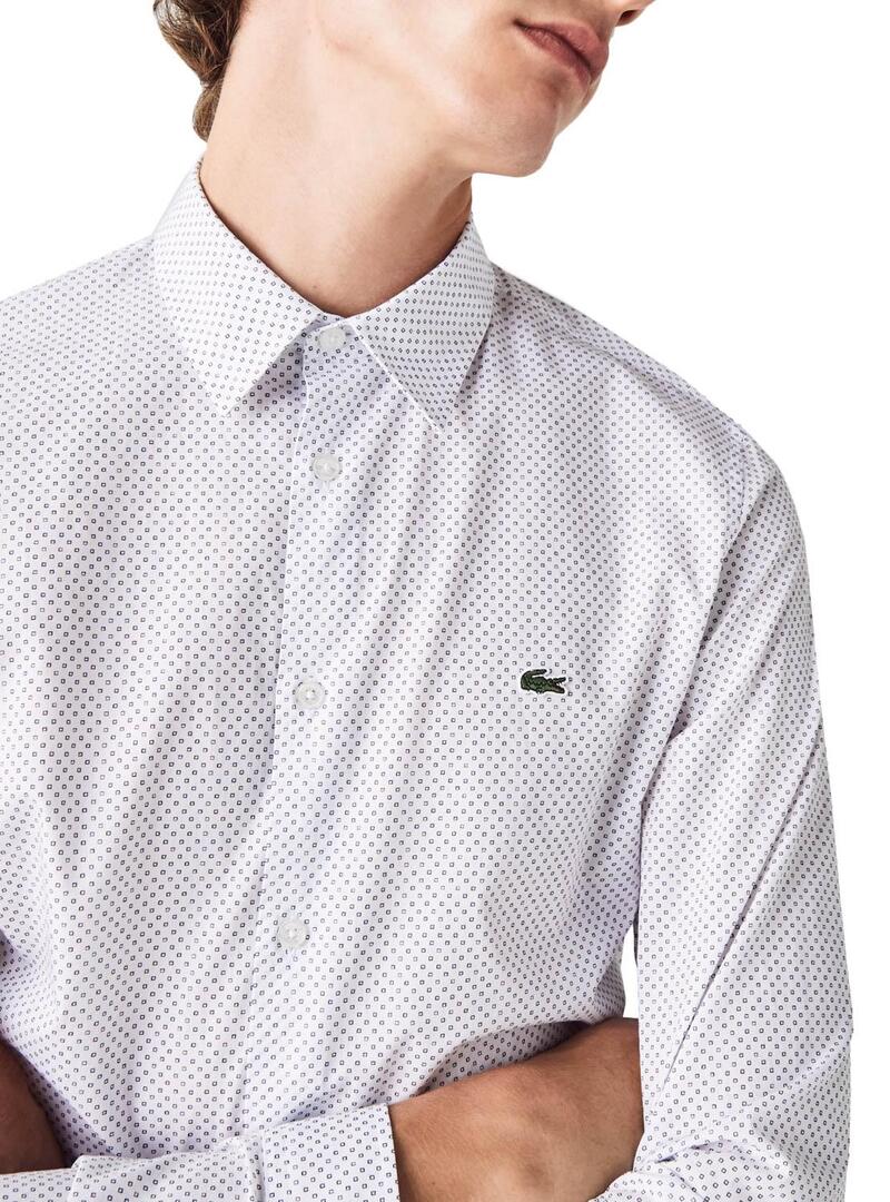 Camisa Lacoste. Micro modelo. Cor branca. Tecido impresso de micro padrão geométrico. Fechamento de botão. Regular fit Bainha arredondada.